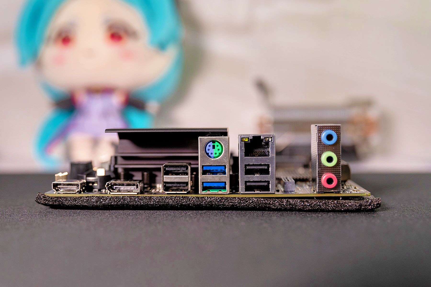 虽然主板非常小巧,但其外部接口依然丰富。从左到右分别是1个HDMI接口、1个DP接口、4个USB 2.0和2个USB 3.0接口,1个PS/2接口,1个网口和3个音频接口。如果是一般办公使用,可以使用带核显的CPU,这样少了独显,在成本上也是非常可观的。另外,主板接口处都采用了金属屏蔽罩,可以有效防止信号干扰影响主板性能或稳定性。