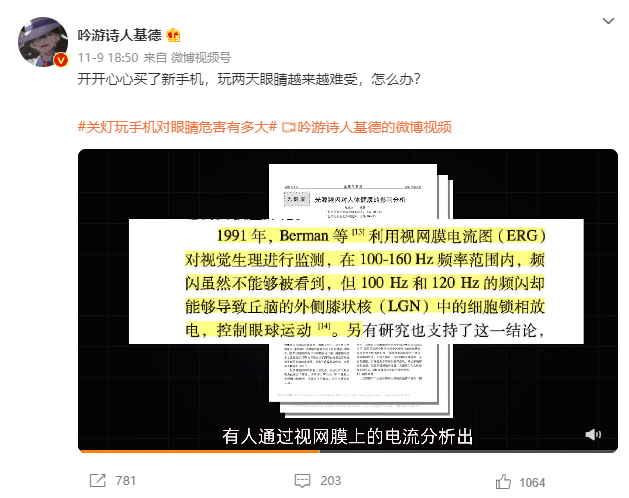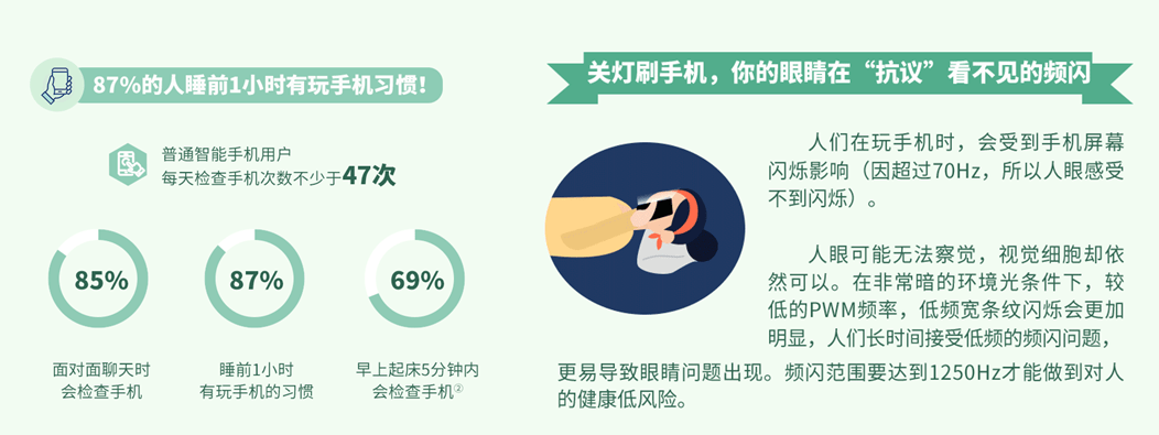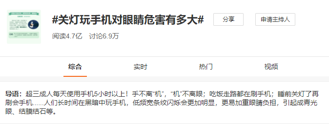 最近,#关灯玩手机对眼睛危害有多大#的微博话题引发了诸多网友关注,尤其是在《健康时报》给出相关数据后,更是冲上了热搜榜第一名。据悉,在日常生活中有超过95%的人存在不良的手机用眼习惯,有87%的人会在睡前1小时玩手机,而这些不良的手机用眼习惯,则会导致沙眼、慢性结膜炎等眼科疾病的发生。此外《健康时报》还指出,除了不良的手机用眼习惯外,手机屏幕的调光频率也对眼部健康存在重大影响。