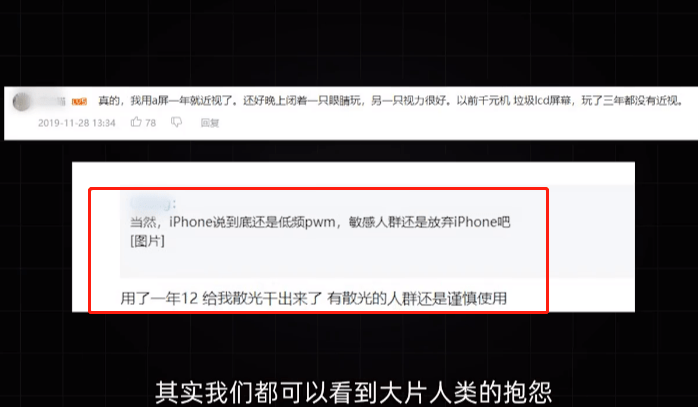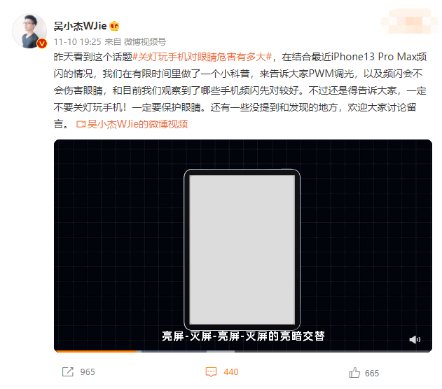 那为什么手机会有频闪的问题呢?对此知名微博博主@吴小杰 给出了相关解答:目前大部分手机都采用OLED屏幕,但OLED屏幕由于无法像LCD屏幕一样单纯采用DC调光,所以在低亮环境下就采用了“亮屏-灭屏-亮屏-灭屏”这种亮暗不断交替的方式,来实现屏幕亮度的控制,也就是俗称的PWM调光。这样做的好处在于能够解决低亮度显示时的色偏问题,而缺点就是屏幕在不断交替亮暗的过程会产生频闪,并且频闪频率不够高的话,还会对使用者造成身体上的不适。