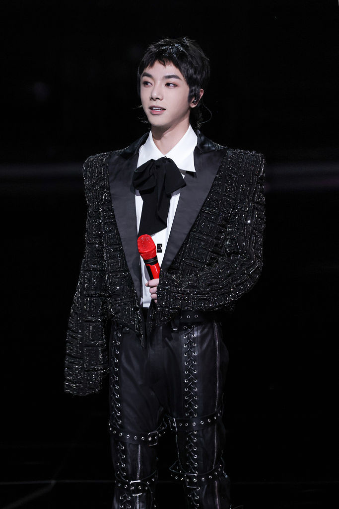 华晨宇黑色亮片垫肩西装搭皮裤摩登吸睛 狼尾发型又酷又野