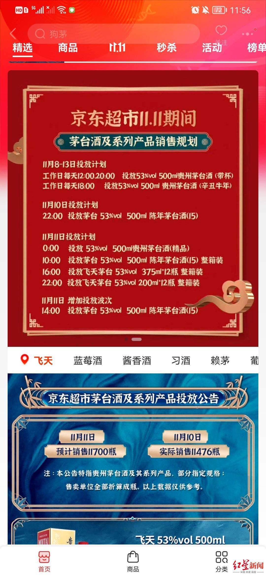 贵州茅台京东自营店显示,11月11日平台预计销售11700瓶茅台酒,11月10日实际销售11476瓶茅台酒;天猫超市显示,11月11日预计投放量为35000瓶,11月10日实际投放量则为445瓶;小米有品显示,11月11日预计投放量为2300瓶,11月10日实际投放量则为598瓶。