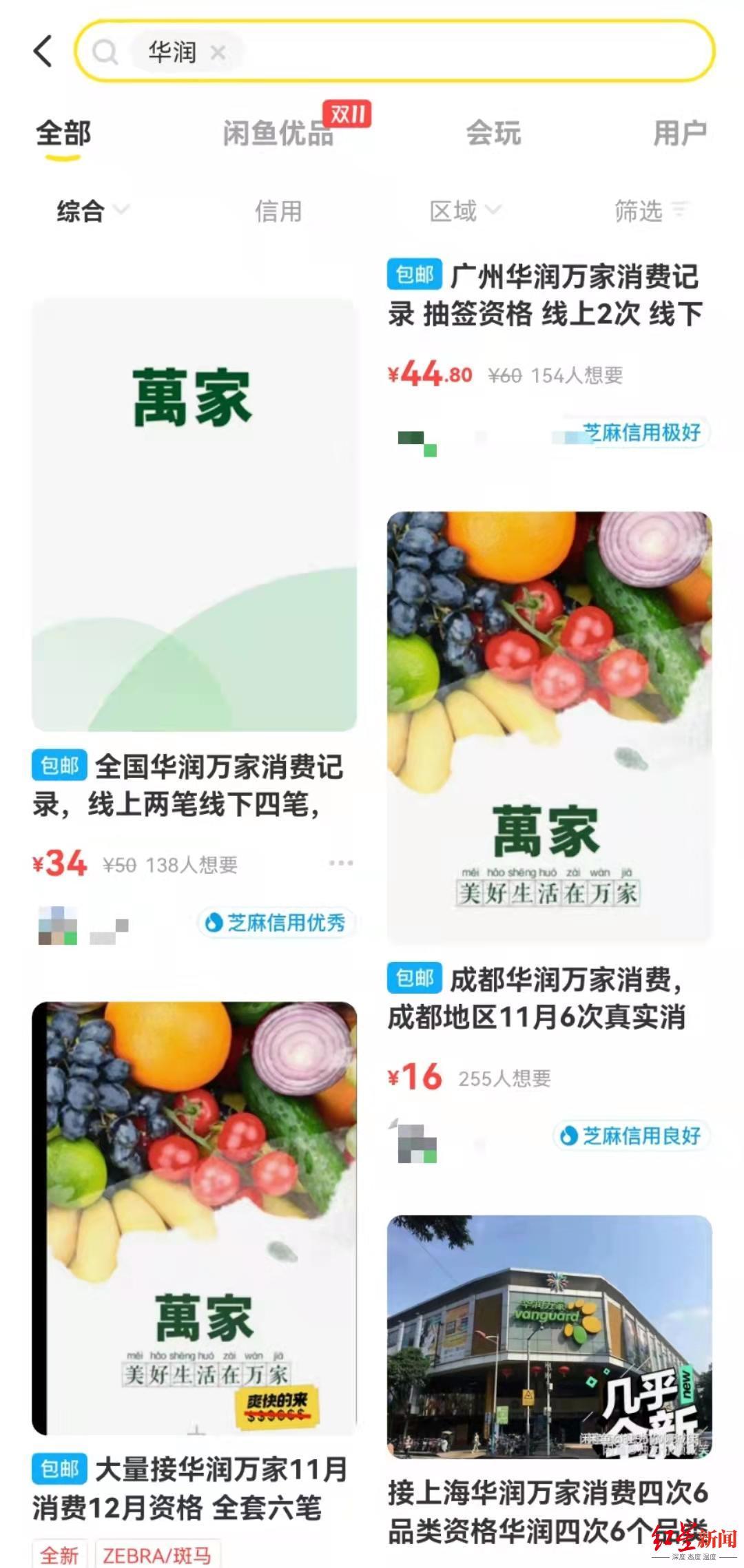 11月11日,红星资本局在闲鱼二手平台上搜索“华润”后,发现了大量代刷抽签资格的黄牛,产品售价为30元上下。商品介绍中,卖家一般只透露“11月消费、12月资格”“4+2模式”“多地可接”等字样,完全不见“茅台”相关。