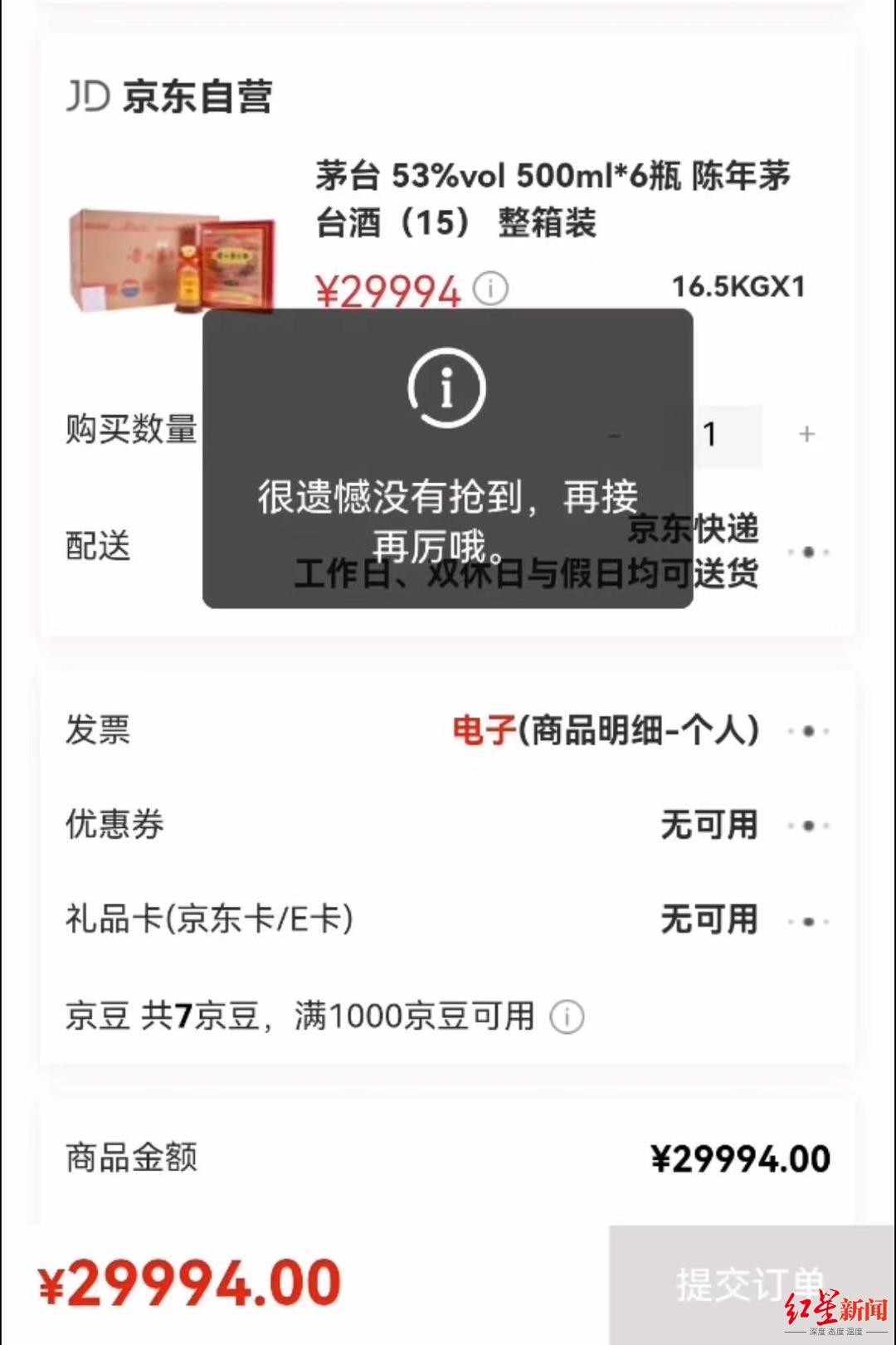 11月11日上午10点整,红星资本局进入京东的53%vol 500ml陈年茅台(15)整箱酒的抢购界面,两台手机疯狂点击后,茅台箱酒“秒光”,随后页面弹出“很遗憾没有抢到,再接再厉哦”的字样提示,宣告抢购失败。