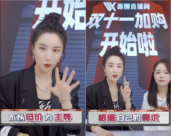 今年双十一,薇娅直播以“拒绝套路”为口号,全程科普产品知识,让消费者拒绝智商税,不一味地贪图便宜、冲击销售数据。引导消费者建立更加健康理性的消费习惯,并帮助更多的好品牌、好创意与消费者见面。