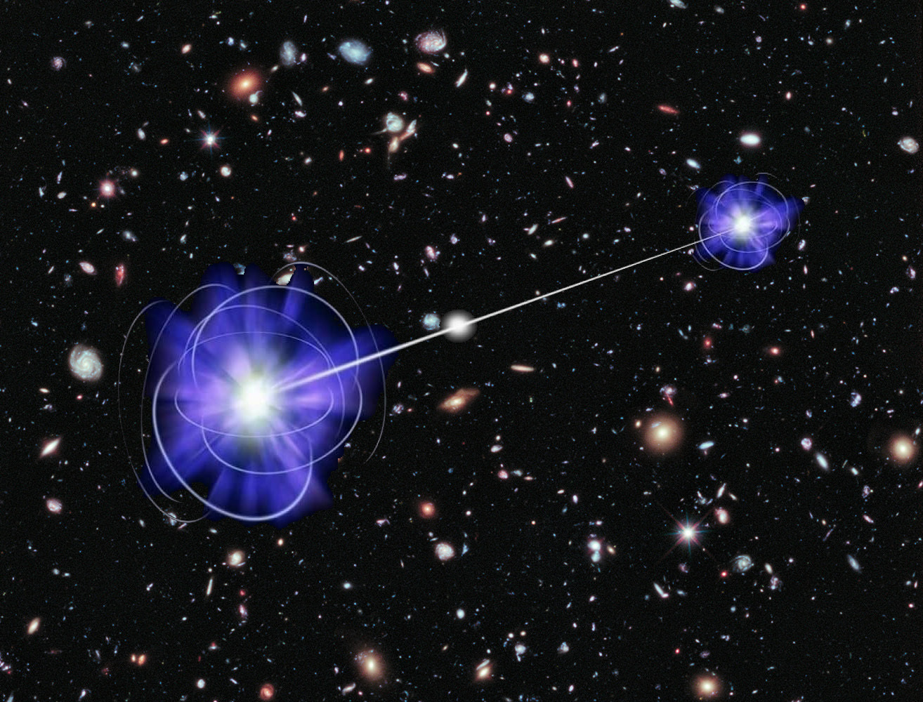 有同学可能要问了,一个波函数坍缩出两个相隔1光年的光子不还是超光速了吗?但量子力学就是这么不讲道理,因为波函数本身就是全空间分布的,波函数坍缩也是全空间坍缩的,无论坍缩到的是1个光子还是100个光子其实都一样。如果认为坍缩到两个光子就是超光速,那么其实坍缩到一个光子你也会认为超光速!比如单光子波函数的全空间坍缩,你就会问,其余所有可能位置的这个光子怎么知道自己已经坍缩到被测量到的那个位置了?如下图: