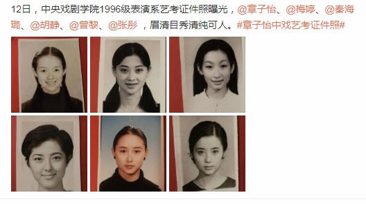 11月12日,网上曝光了一组中央戏剧学院1996级表演系艺考证件照,其中包括章子怡、梅婷、秦海璐、曾黎、胡静、张彤。在那个没有PS的年代,几位漂亮姐姐的证件照一个赛一个耐打,随便拿出一张都是妥妥的盛世美颜。
