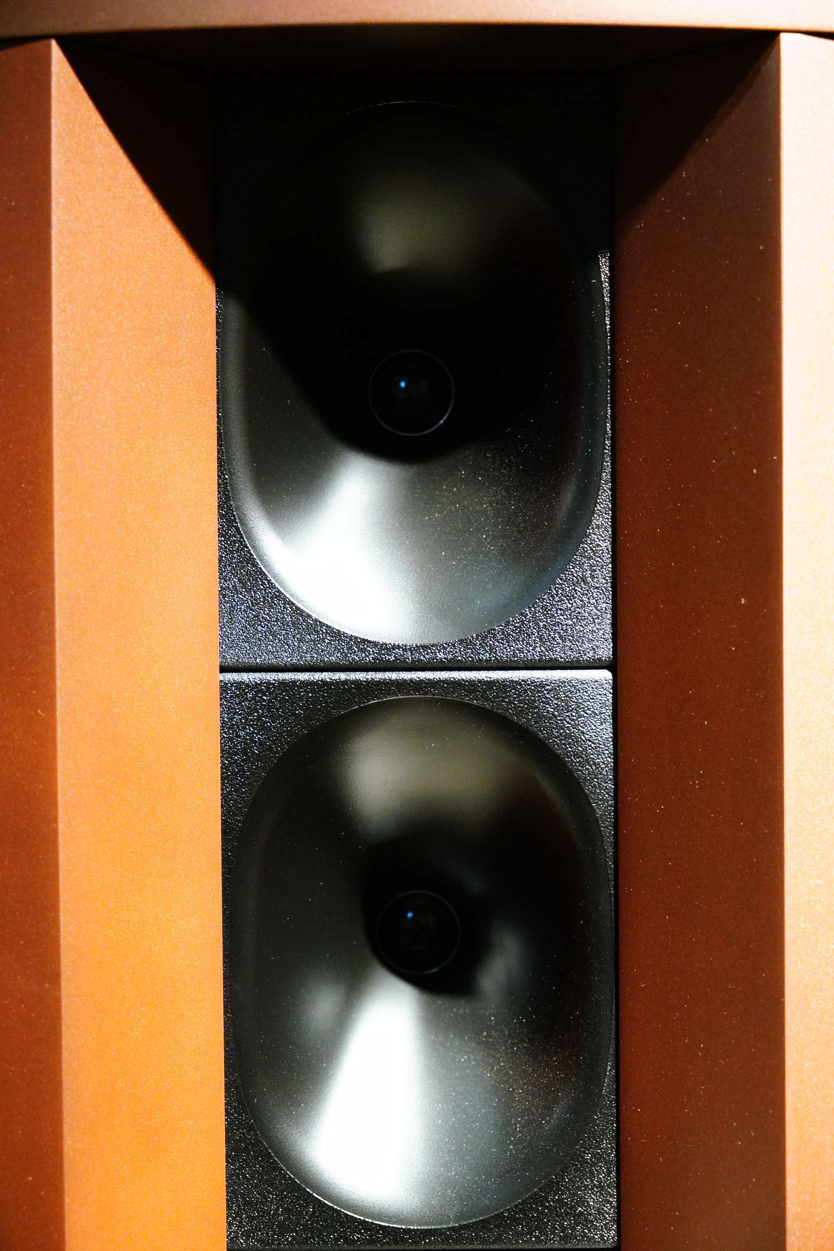 在单元应用和设计方面。Terra应用了两颗1英寸高音,号角扩散嘴采用了不太常见的上下扁圆的开口设计,这样设计的目的推测是能够更好地与外侧的木质扩散装置衔接,从而形成“大波导”的设计理念。