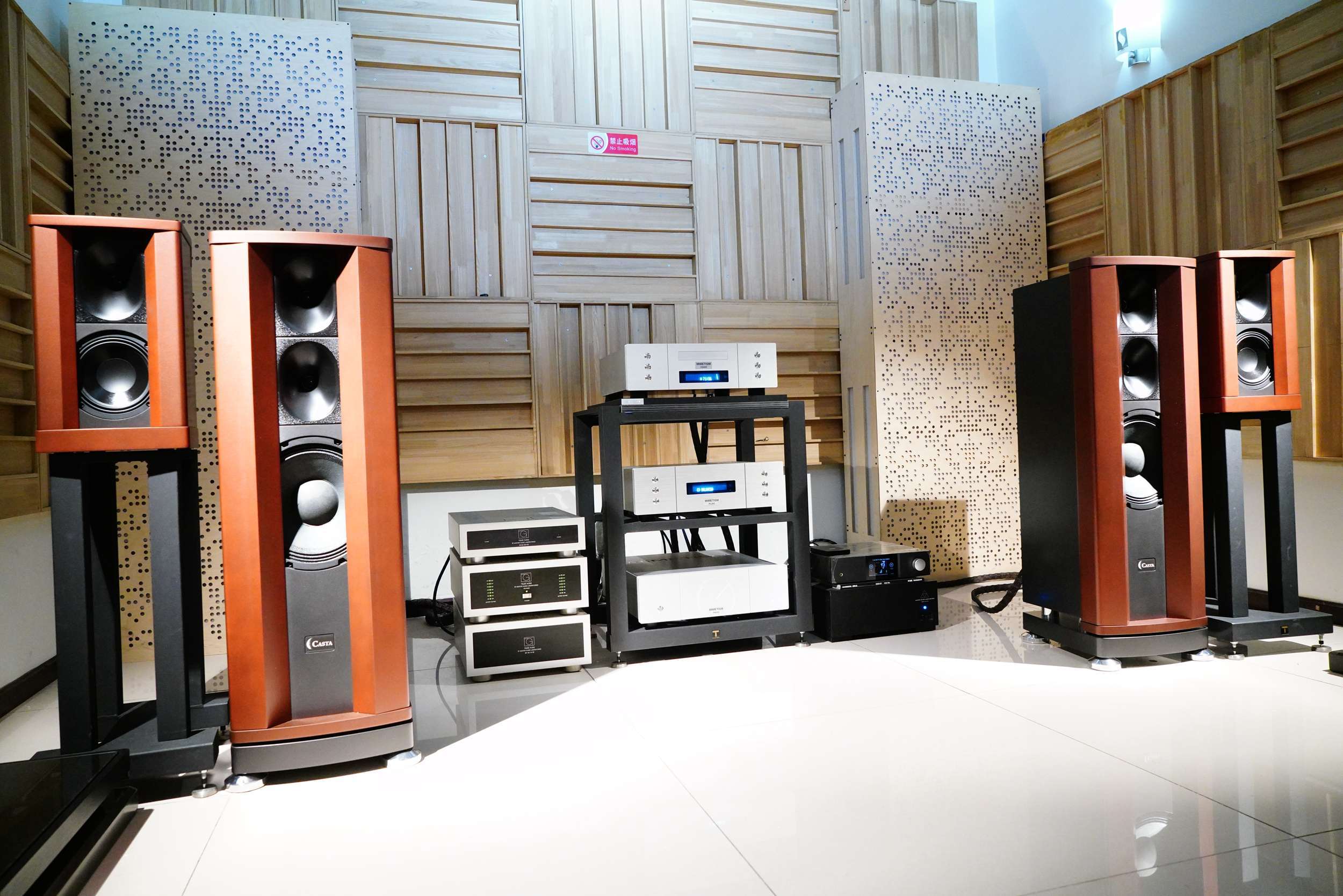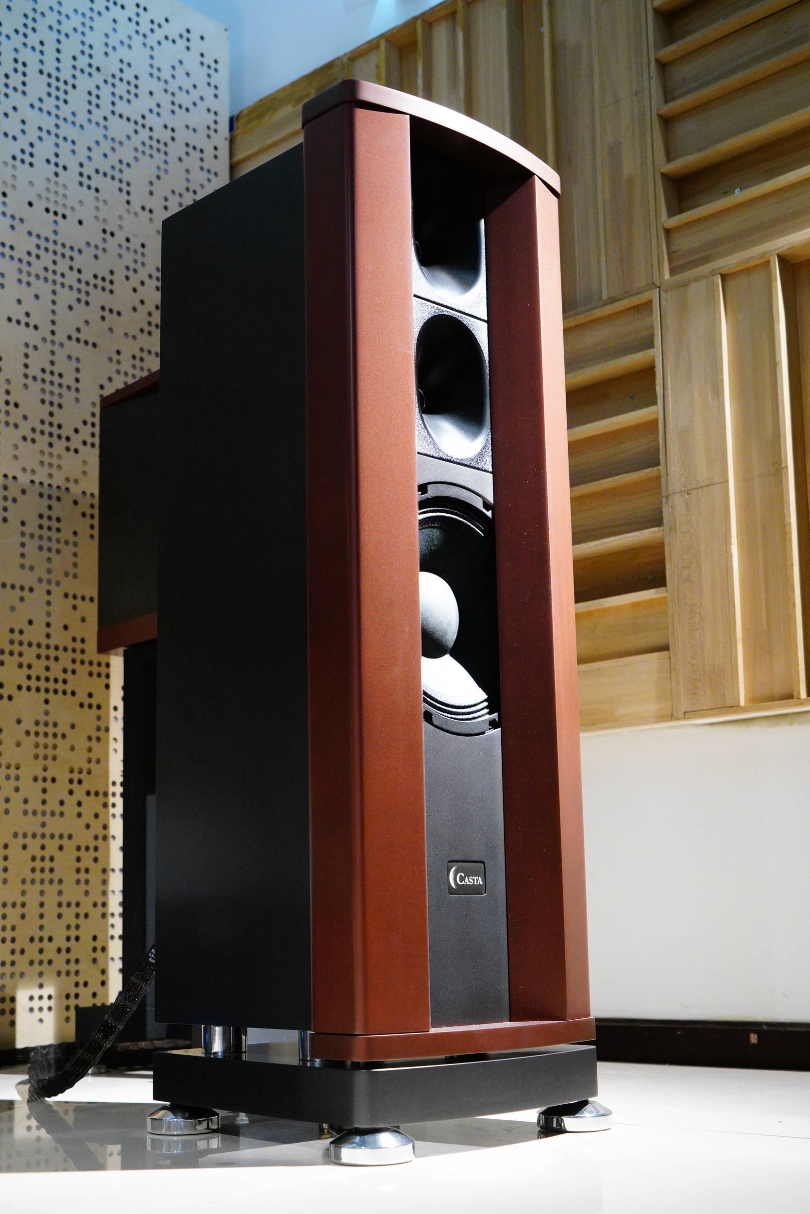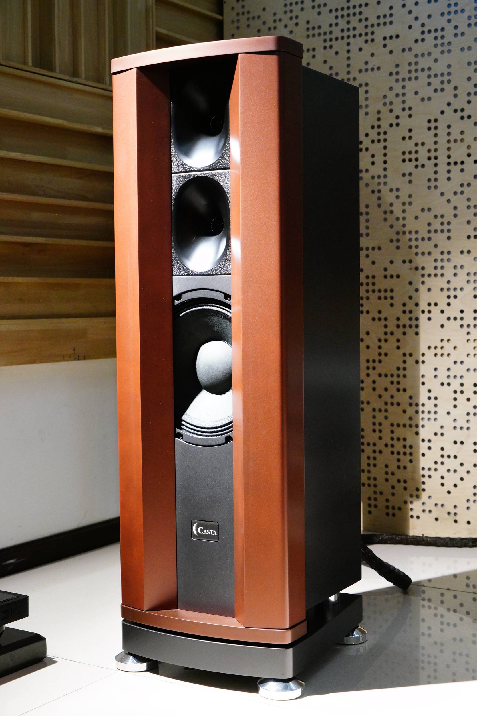 北京鑫星光音响作为京城资深的高级音响代理/经销商,老板纪总在三十余年的音响行业从业经历中,总结了非常丰富的音响听音和调校经验,自然也有自己对于正确声音的独到理解。他多年来经手的器材无数,对于各个品牌产品的特点了然于胸。近年来所代理/经销的音箱产品,尤以号角类音箱居多,较有代表性的有德国动能(DynamiKKs!)、布鲁门和夫(Blumenhofer)等,近期听闻纪总处新到了来自意大利的Casta Acoustics(卡仕达)号角音箱,于是抱着好奇的心理前往一试。
