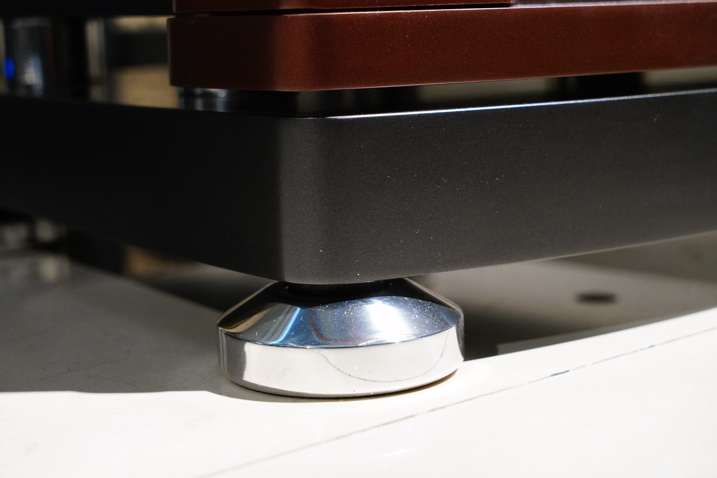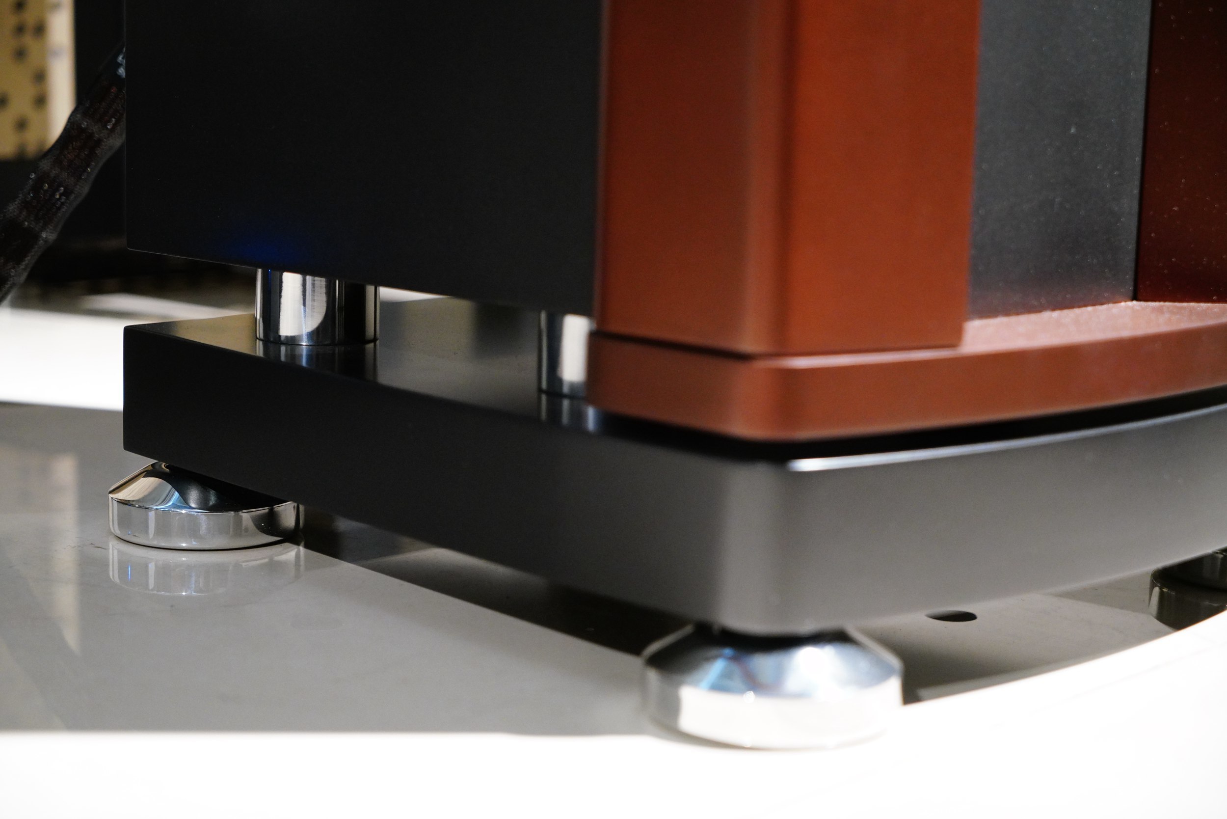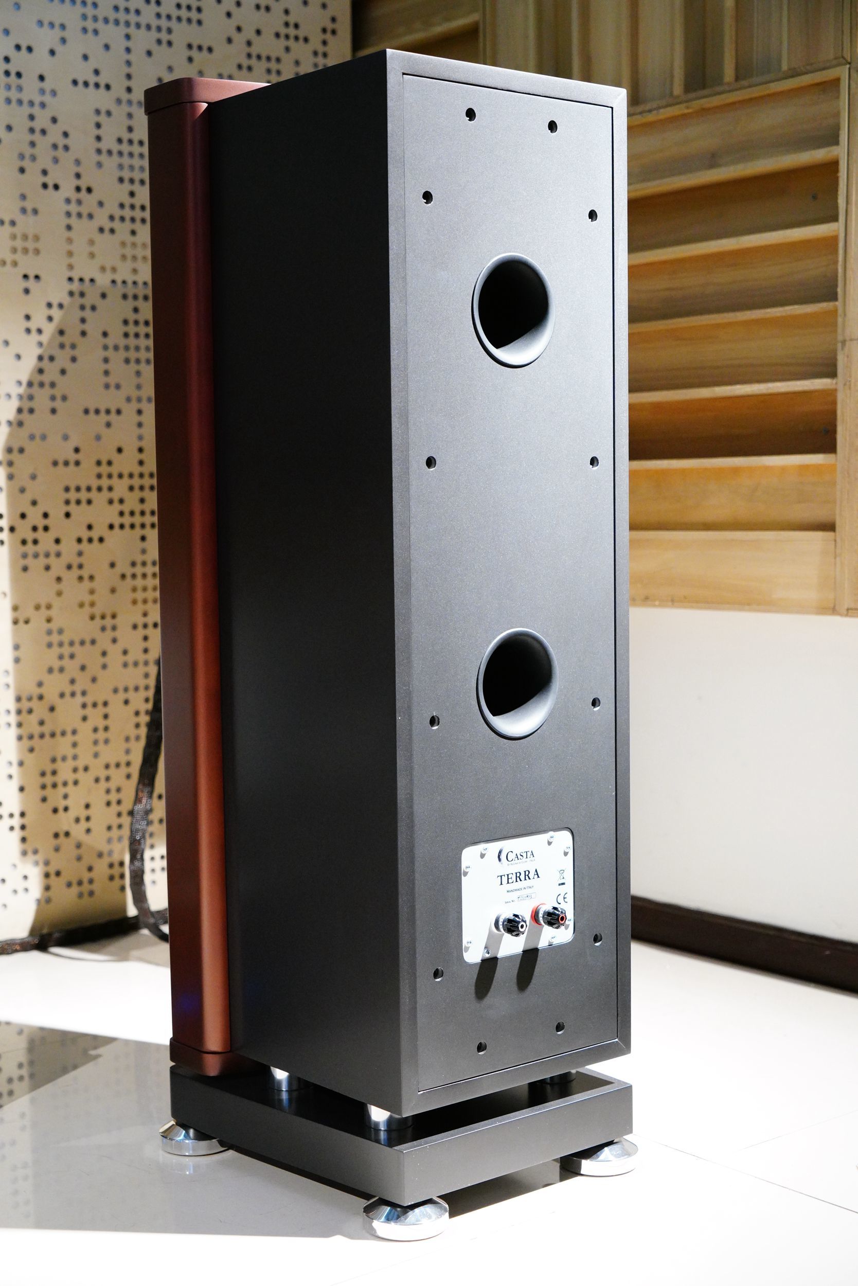 Terra的外形非常有特点,一眼望去,这款音箱大约可以分为三个主要的部分——核心的箱体部分,装载了扬声器单元、分频器等元器件;箱体前部的大型木质扩散装置,形成了一个细长的号角扩散结构,该结构与高音号角嘴衔接,共同组成了Casta标志性的“大波导”设计;底座,我们可以发现,箱体的主体部分与底座是分离式设计,底座采用四个大型承托脚钉,这样既可以保证箱体的稳定性,同时可以隔绝不必要的有害震动。
