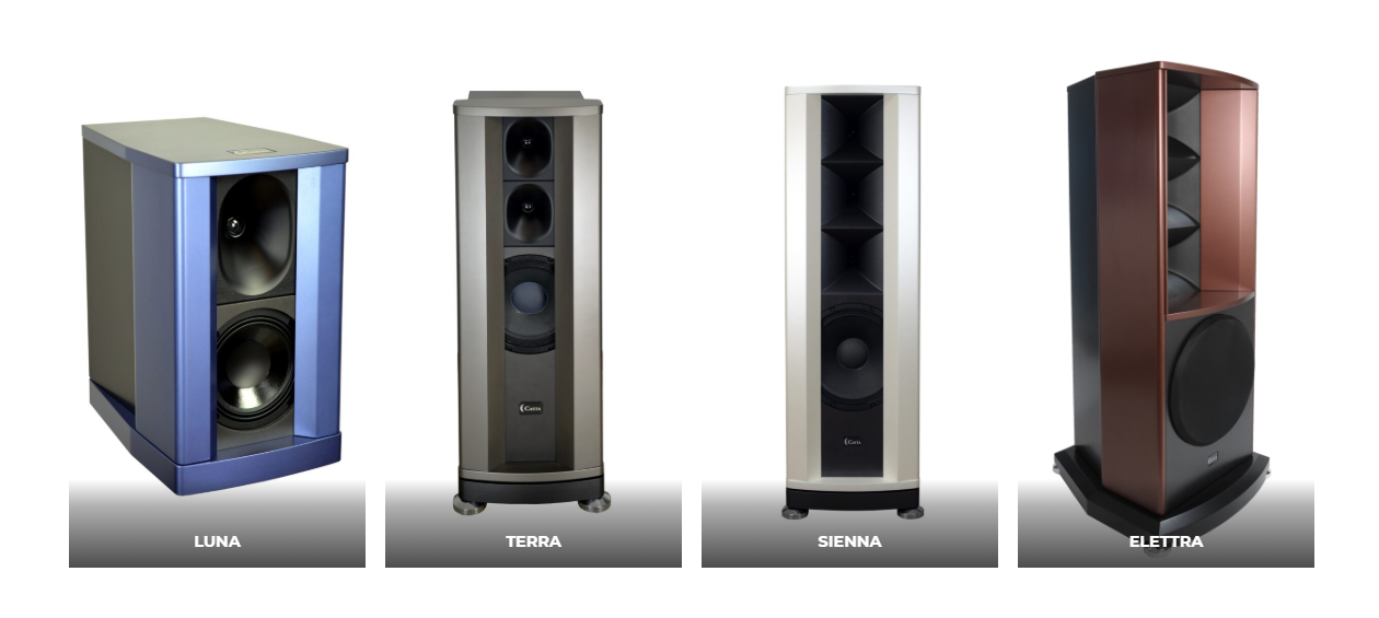 查阅Casta Acoustics的官网可以得知,该品牌目前旗下共有4款音箱产品,分别是Luna书架式音箱、Terra、Sienna和旗舰Elettra,后三款均为落地式音箱。