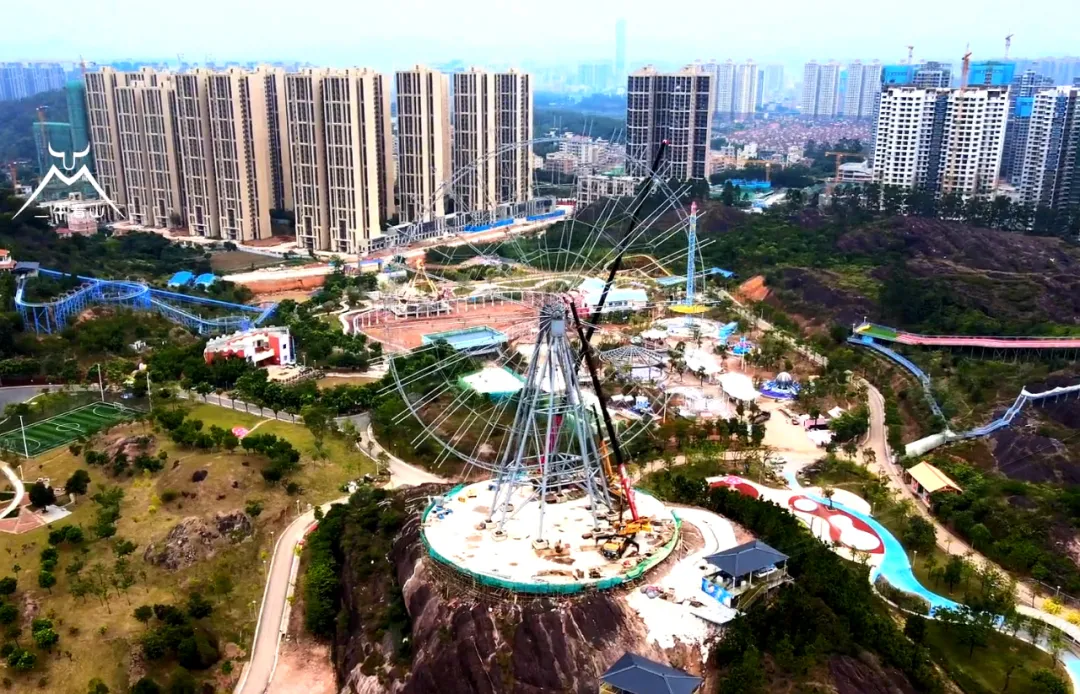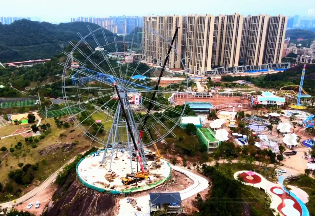 值得注意的是,建设在山顶上的摩天轮框架已经完成,正准备安装车厢。