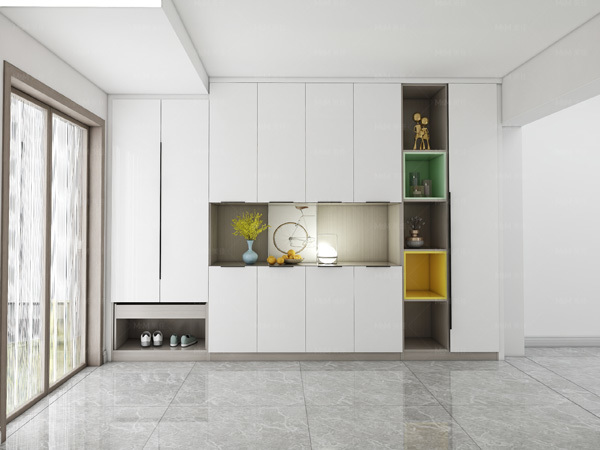 现在家里的入户位置很多人除了平开门设计,还喜欢选择空格储物,就是摆放家里的喜欢的物品,相框、饰品等都可以放在空格里。除了基础鞋柜设计还有储物柜,这样多余的空间得到合理利用,又能满足日常所要的收纳,这样物品被收纳到柜体里不会看着很凌乱。
