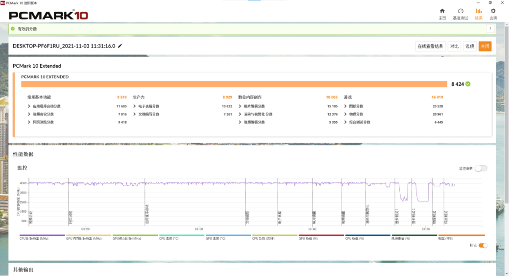 整机综合性能表现方面,技嘉AORUS 15P在PCMark 10测试中,它的常用基本功能得分为9510分,生产力得分为8929分,数位内容创作得分为10003分,游戏得分为16019分。这样的成绩表现说明,技嘉AORUS 15P不仅可以作为性能强劲的开黑神器,也可以作为可靠的生产力工具。