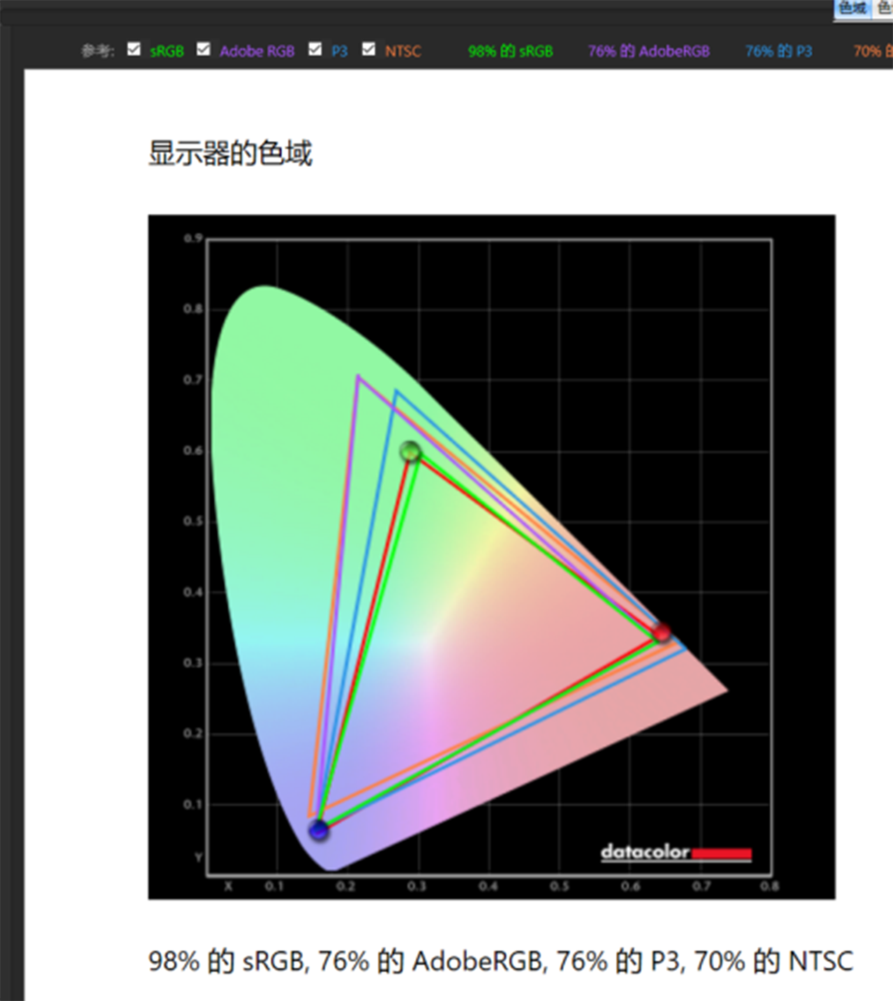 技嘉AORUS 15P屏幕的色彩表现也非常出色,经过实测,它的sRGB色域为98%,AdobeRGB色域为76%,NTSC色域为70%,P3色域为76%,色准平均△E仅为1.68。可以看出,色彩表现准确,色彩覆盖范围广,在带来更加真实震撼的游戏体验的同时,同时也能应对内容创作场景。