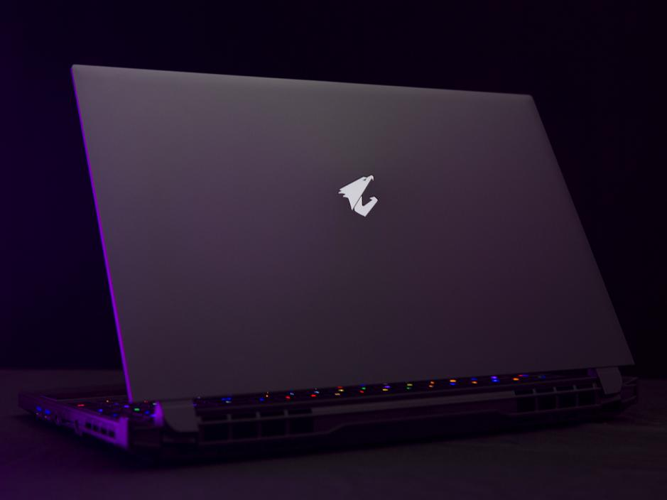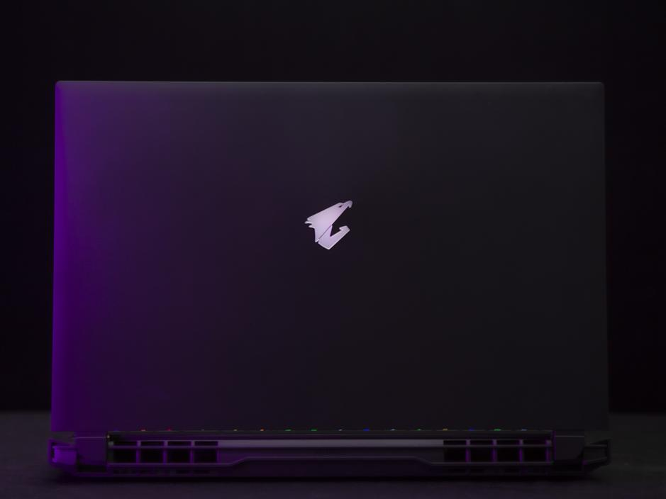 技嘉AORUS 15P的机身设计理念来源于跑车,看上去十分炫酷拉风,拥有强烈的速度感和电竞感,机身的整体配色以电竞黑为主,机身触感丝滑而细腻。整机厚度为27mm,机身重量约在2.2kg左右,在游戏本中算是身形比较轻便的了。技嘉AORUS 15P的A面正中间位置拥有技嘉大雕的图形Logo,并且拥有纯白色背光,开机即亮。