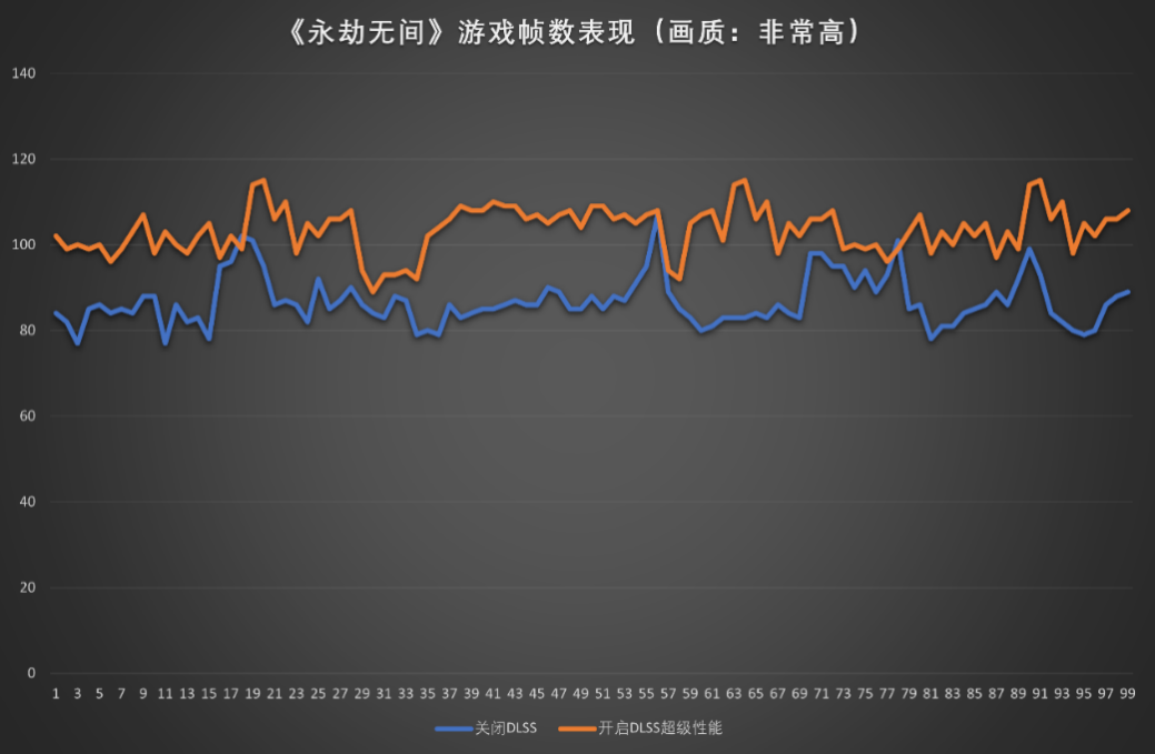 《永劫无间》是前段时间推出的国风版吃鸡类游戏,这款游戏可以支持NVIDIA DLSS技术,为了可以更好地了解DLSS技术对游戏帧数的提升幅度,我们对比了同一特效下DLSS开启和关闭后的帧数。在最高画质下,关闭DLSS时,技嘉AORUS 15P的平均帧数在85帧左右;在开启DLSS超级性能时,平均帧数上升到110帧左右。所以可见DLSS技术对于游戏流畅度的提升是相当明显的。
