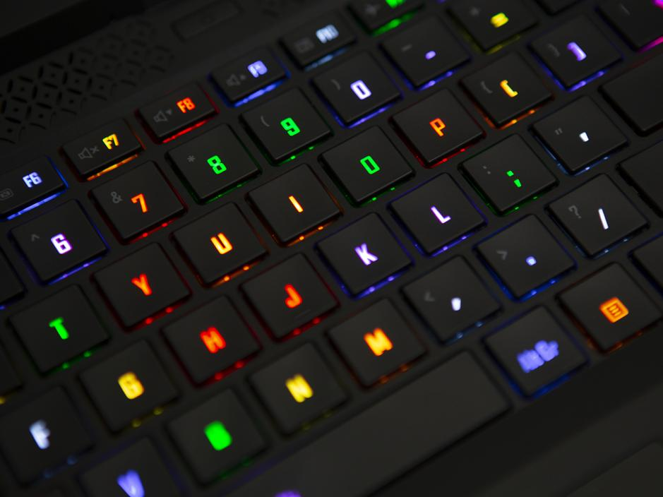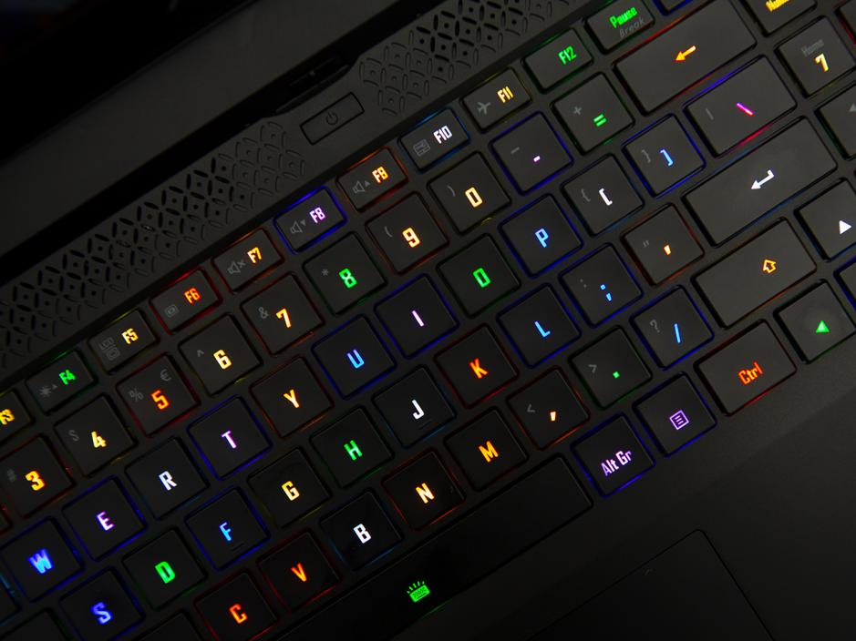 键盘方面,技嘉AORUS 15P采用的是101键全尺寸键盘,拥有全高的方向和独立的小键盘区,键程设计合理,反馈清晰,操控手感更加畅爽。可以让玩家更加准确地释放技能。键盘搭载了AORUS Fusion技术,每个按键都可以独立控光,支持1670万色显示,用户可以根据自己的爱好设置背光方案。同时键盘支持全区域防鬼键功能。