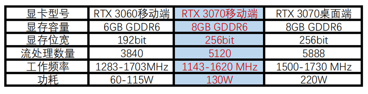 和入门级的RTX 3060笔记本GPU相比,RTX 3070笔记本GPU在各个关键参数方面均有明显提升。和桌面端的RTX 3070相比,流处理器数量少了768个,频率和功耗有所下降,但是显存容量和显存位宽都保持一致,所以基本可以满足大型游戏的运行需求。