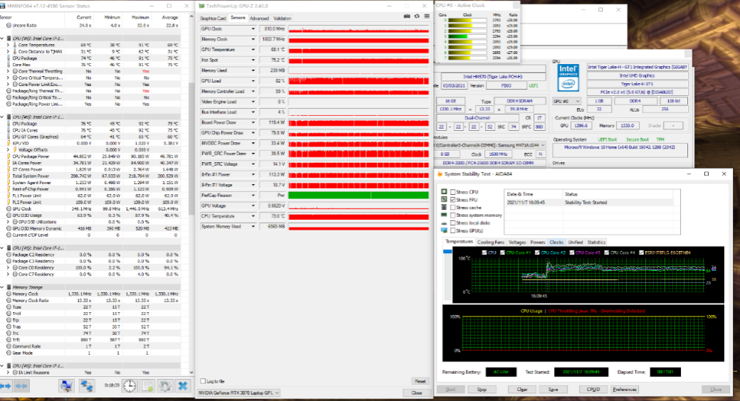 为了可以进一步地了解技嘉AORUS 15P的散热性能,我们对它的处理器和显卡进行了满载双拷测试(AIDA64+FurMark)15分钟,处理器的温度在76℃左右,频率为2.8GHz,功耗可以释放至44W;显卡的温度稳定在68℃,频率为810MHz,功耗为119W。无论是处理器,还是显卡,性能释放十分极致,丝毫没有妥协。