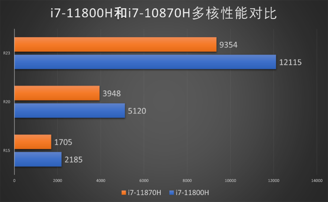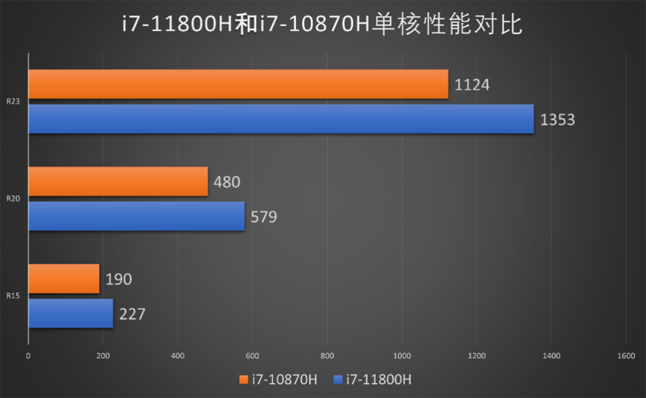 Intel Core i7-11800H处理器的实际性能表现不容小觑,我们使用了多款CPU性能测试软件对它进行了跑分。在Cinebench R15中的多核成绩为2158cb,单核成绩为227cb;在Cinebench R20中的多核成绩为5120pts,单核成绩为579pts;在Cinebench R23中的多核成绩为12115pts,单核成绩为1353pts。和上代的Intel Core i7-10870H处理器相比,单核性能提升20%左右,多核性能提升幅度高达29%。得益于全新架构和制程,十一代酷睿标压处理器在性能方面的提升非常明显。