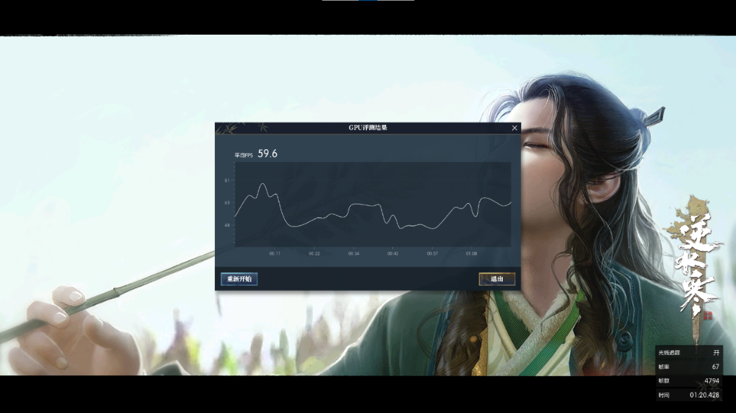《逆水寒》则是对光线追踪特效和DLSS技术适配较好的国产网络游戏大作,该游戏对于显卡的性能要求较高,在测试该游戏时,我们开启光线追踪和DLSS,技嘉AORUS 15P的平均游戏帧数在59帧左右,非常接近60帧,也就是说技嘉AORUS 15P完全可以以全特效运行这款游戏。