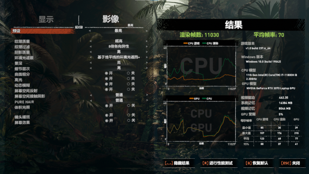 《古墓丽影:暗影》是一款对光线追踪特效支持较好的3A游戏大作,在测试该游戏时,我们将画质调整最高,光线追踪设置改为基于地平线的环境光遮挡,技嘉AORUS 15P的实际表现非常不错,游戏平均帧数为70帧,说明技嘉AORUS 15P可以以全特效运行3A大作。