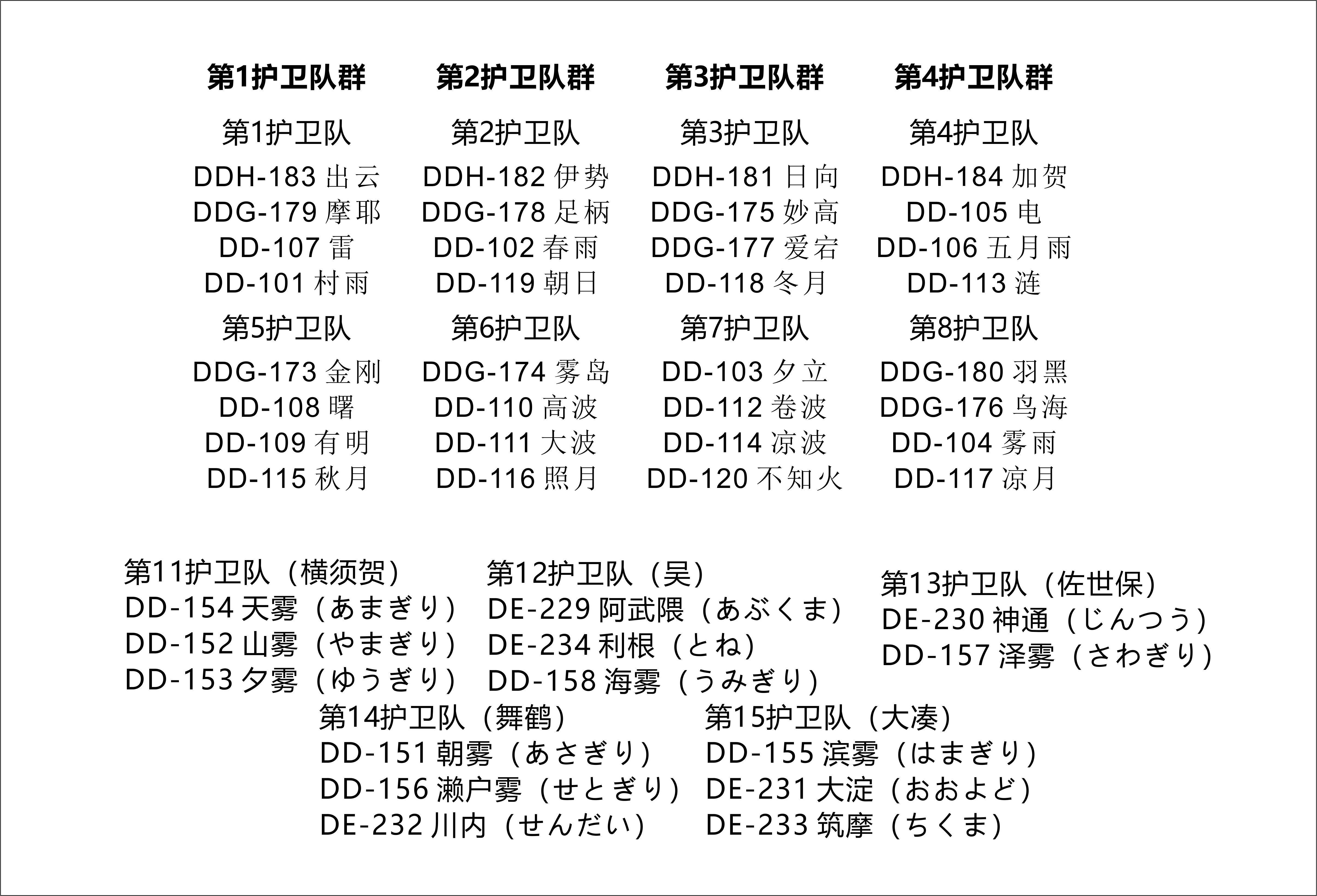 日本的四个护卫队群里,每个护卫队群由一艘直升机航母(日向级、出云级)作为旗舰。剩下舰艇分别是两艘摩耶级、四艘金刚级、两艘爱宕级、四艘秋月级、两艘朝日级、五艘高波级、九艘村雨级。其中,战力最强的,是搭载宙斯盾系统的摩耶级、爱宕级、金刚级的八艘盾舰,其余都是四五千吨级的舰艇。