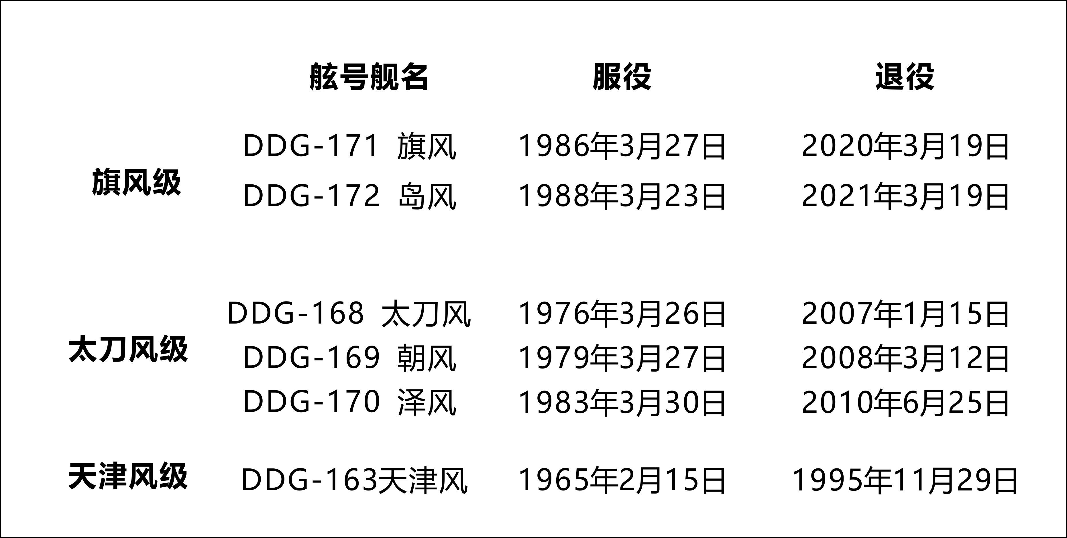 旗风级的前型太刀风级,满载排水量5200吨,日本共计生产三艘。一号舰.太刀风号,1976年3月26日服役,2007年1月15日退役,共计服役32年。二号舰朝风号,1979年3月27日服役,2008年3月12日退役,服役29年。三号舰泽风号,1983年3月30日服役,2010年6月25日退役,服役27年。再往前,有一艘天津风级,只有一艘服役,3050吨排水量,1965 年 2 月 15 日服役,1995 年 11 月 29 日退役,服役三十年。
