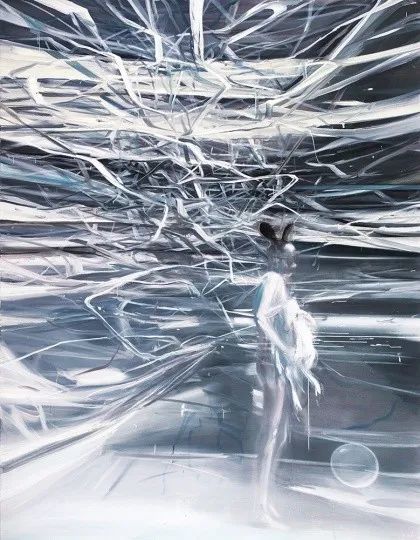 贾蔼力的画同样很有记忆点,除了尺幅都很大,他的早期作品还有浓浓的“废土”和“赛博朋克”风,仿佛一种末日预言。而在新近开幕的展览中,绘画成为艺术家通往彼岸的桥梁,个人经历、时代烙印、梦境幻想以及各种过去、现在、未来在画面中叠加涌现,并产生出了与我们每个人的呼应。在贾蔼力的作品面前,我们首先要做的,是追问自己的内心,能够感受到什么。