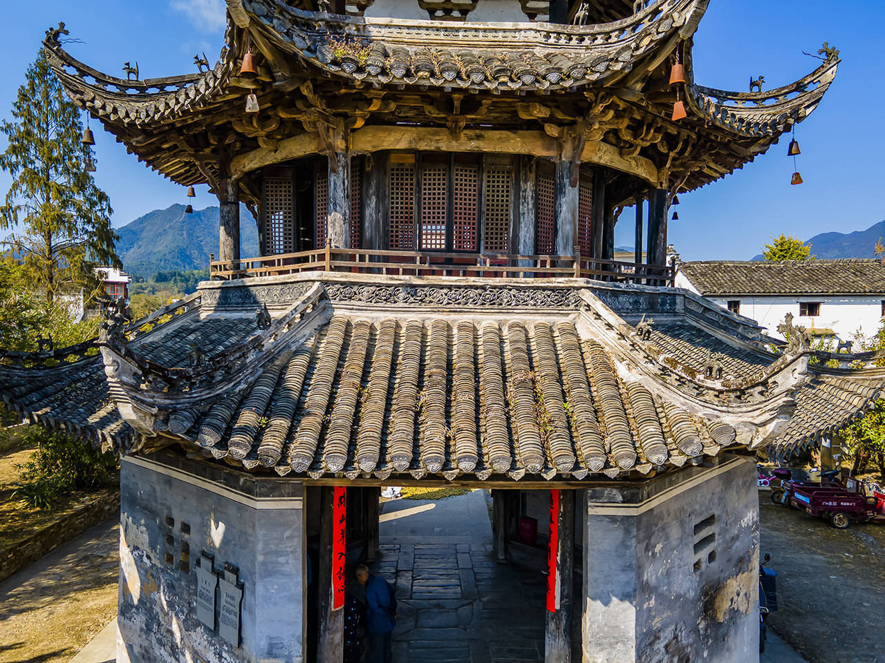 大观亭建于明嘉靖年间,八角三重檐歇山顶,一层内部副阶匝,八金柱间各以乳袱衔接,月梁上承一科三升承载上层板。 整座亭阁造型 浑然一体、有一些明代遗风。一定要跟着村里的导游听听每个大宅门和每个牌坊后面的故事,绝对不虚此行。