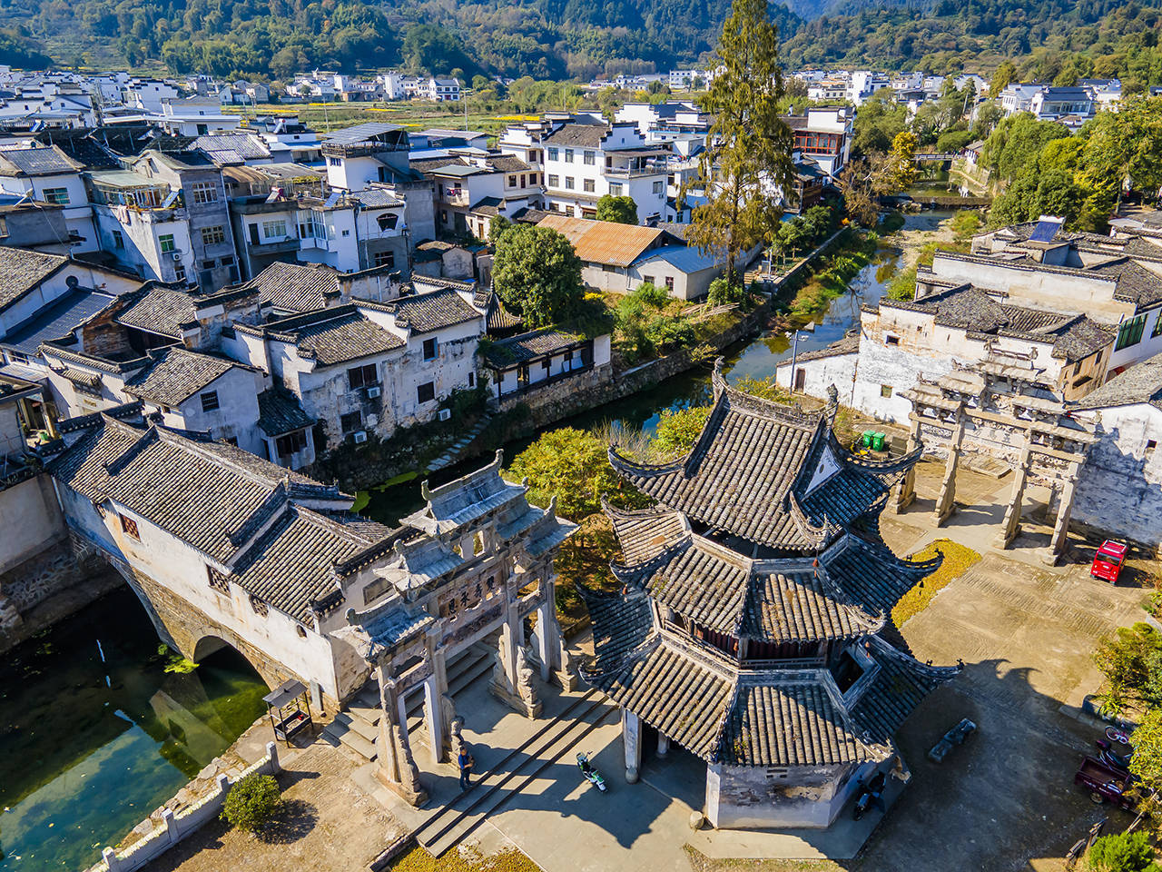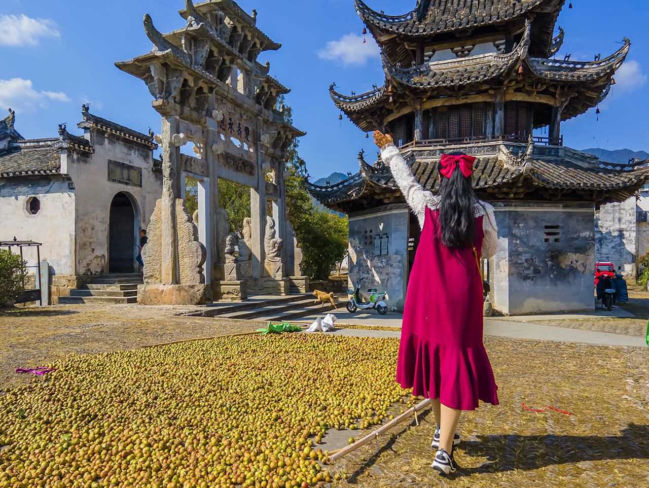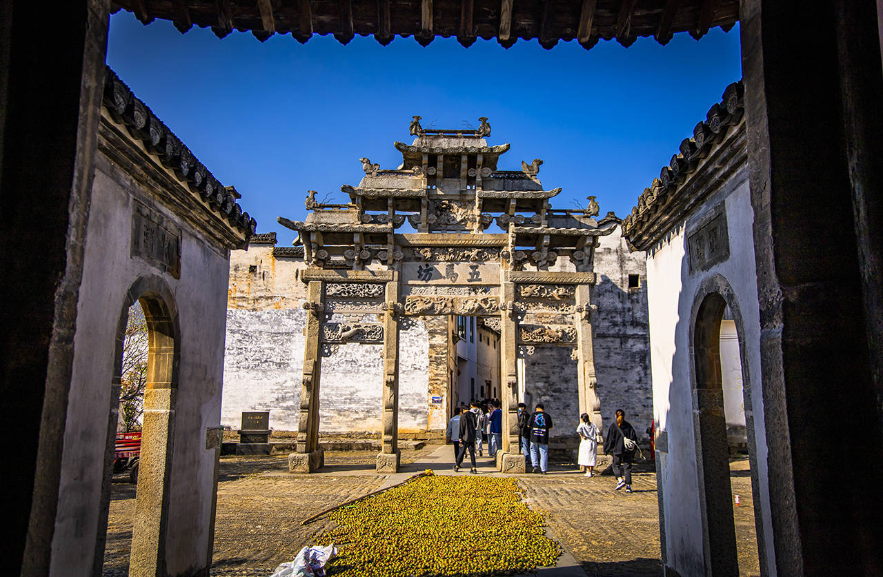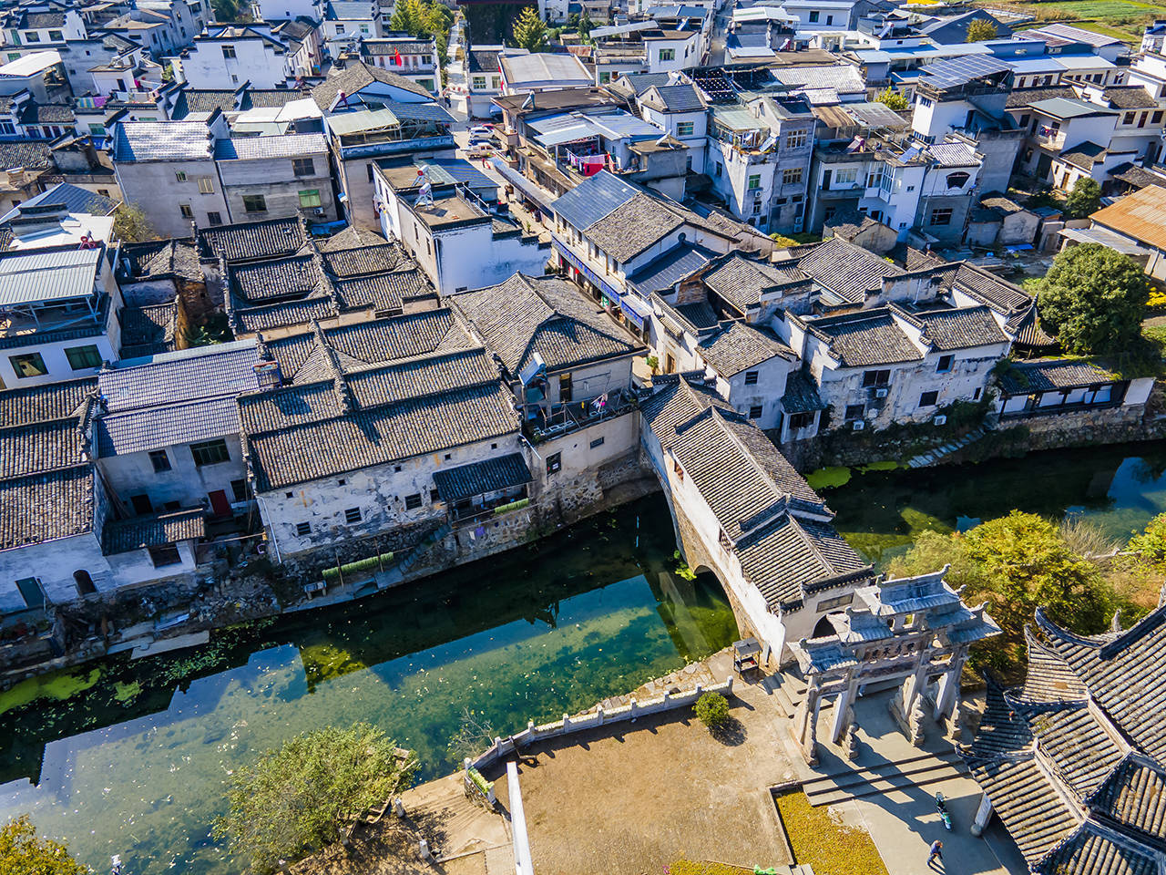秋冬日里,每家每户都在晒秋,沿着东西走向的高阳廊桥走出来,几座牌坊下都已经被铺满各种秋收农作物,在太阳下晒着丰收的喜悦。 村民们就在自家的老房子中生活,走去旁边的镇子也不过几步路的距离,小桥流水古色古香这就是一复一日的人间烟火。