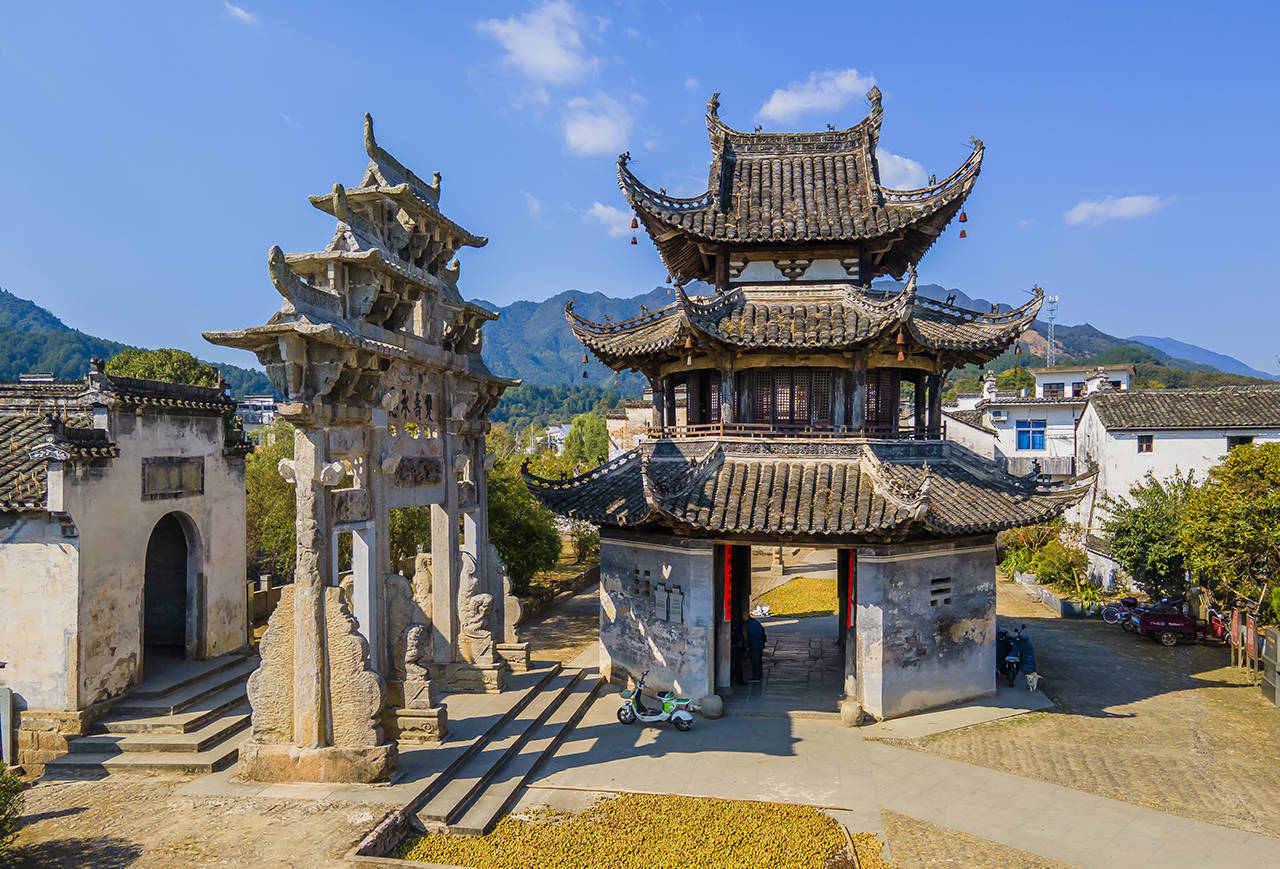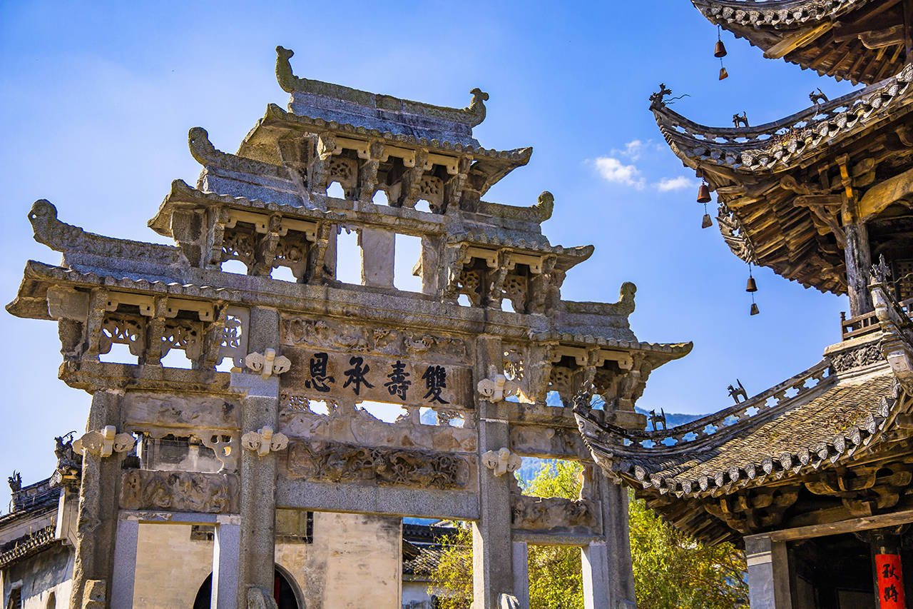 建造于明隆庆年间,双寿承恩坊,就在大观亭旁边,许村昉溪高阳廊桥桥头,是一座四柱三间五楼的石牌坊。这是全国唯一一座夫妻百岁老人寿坊,因这对夫妻双双过百岁,皇帝下令建牌坊纪念。