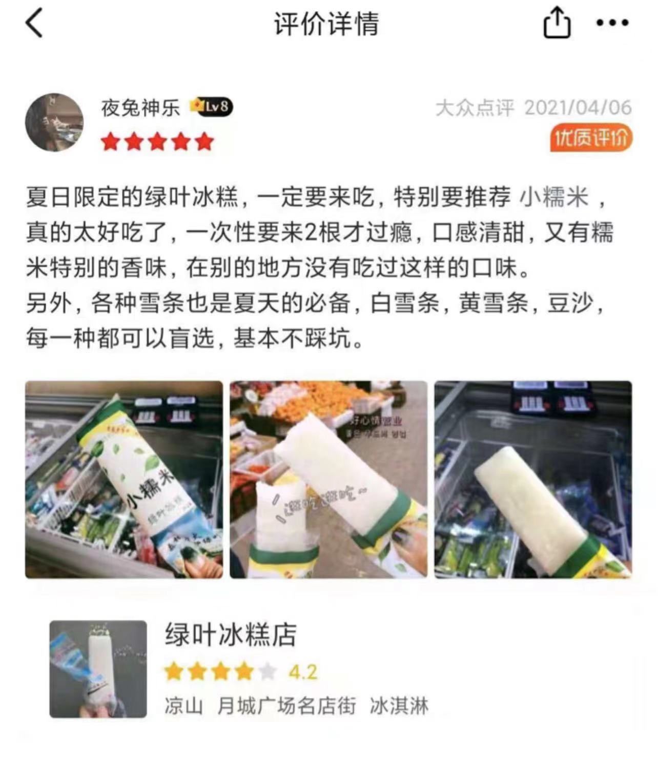 不得不提一个让我们感到意外又惊喜的地区:江西。我们原本的目标是江压冰棍,但苦于搜索无果,但却无意中发现天凯乐这这个悄悄萌芽的小众品牌。它有一款奶豆腐雪糕,对它最神奇的一条评价是:“仿佛回到了小时候母乳的味道”,真是极高的赞誉了。把定位移到它所在的江西新余,只需1.5元,你就能拥有糯米滋、脆皮芝麻、秘制红豆叠加的快乐。