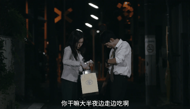 一个压低嗓音抱怨:“你干嘛大半夜边走边吃啊!”
