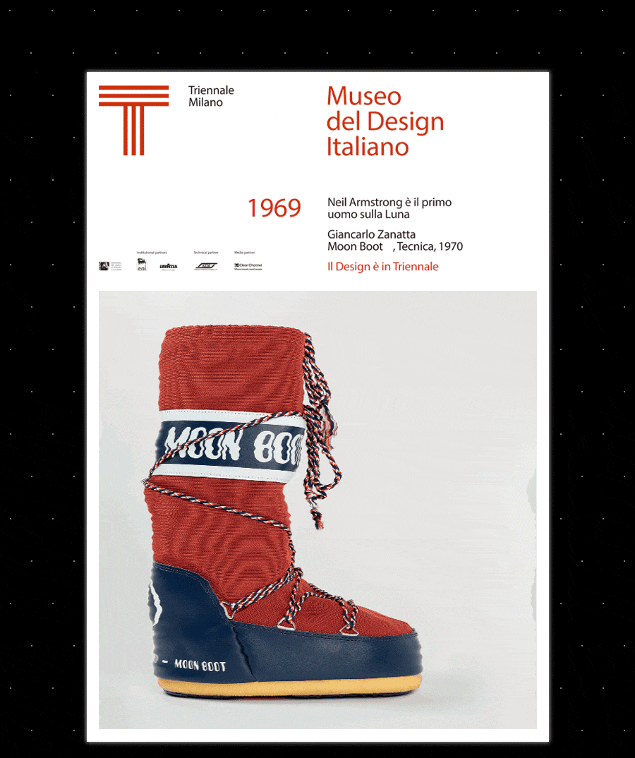 而这款月亮靴的设计灵感来源也是十分有趣,在1969年来自意大利的年轻鞋匠Giancarle Zanatta在看到人类第一次登月直播时产生灵感。感动于人类对于月球的探索,最终与宇航鞋的特殊廓形与航天技术为灵感,打造出了这款名为Moon Boot 的月亮靴。