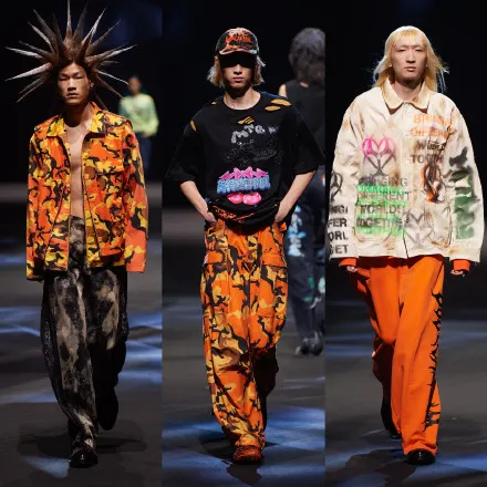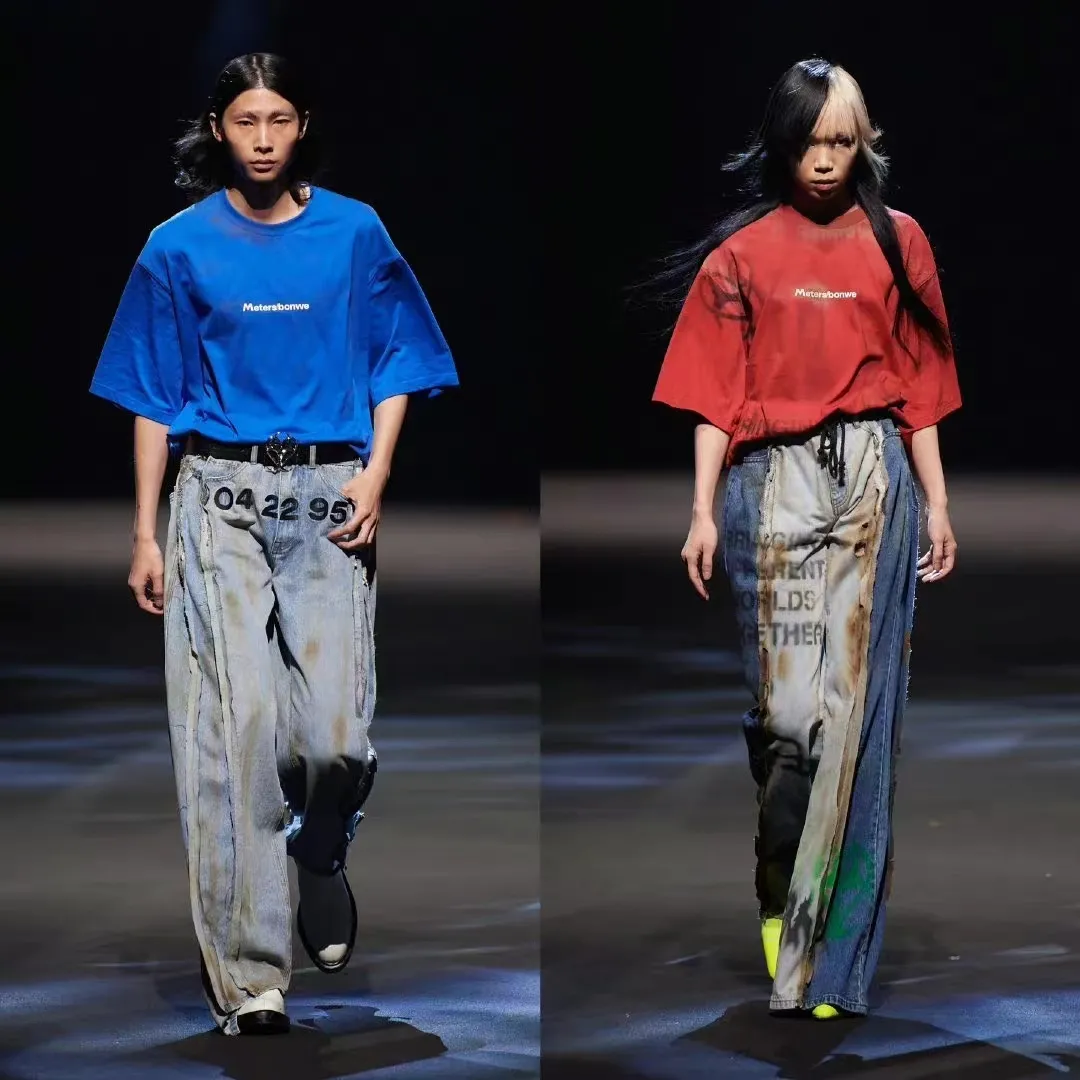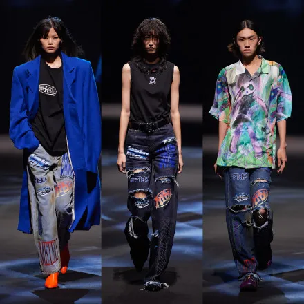 整个秀场也呈现出一种反主流理念,代表着千禧一代的“刺猬头”“涂鸦泼墨”“破洞裤”等元素也被上官喆熟练运用至整个秀场之中。