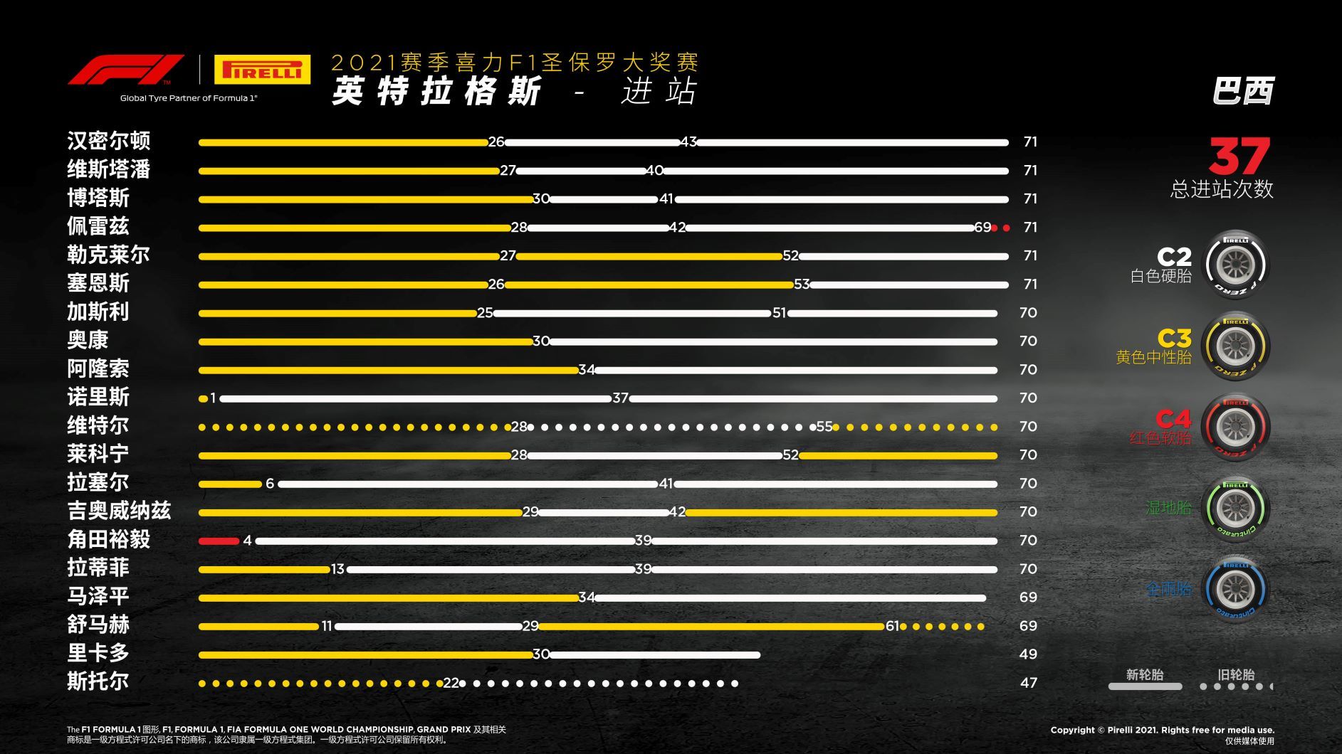 • 硬胎C2:是比赛的关键:所有车手都使用了该款配方轮胎,领先集团的车手们都使用了两套新硬胎,尽管比赛周末之前的时间他们从未使用过该款配方。在如此高温的情况下,该款配方轮胎表现极其出色,非常快速也非常稳定。这也有助于带来极其灵活的进站窗口。