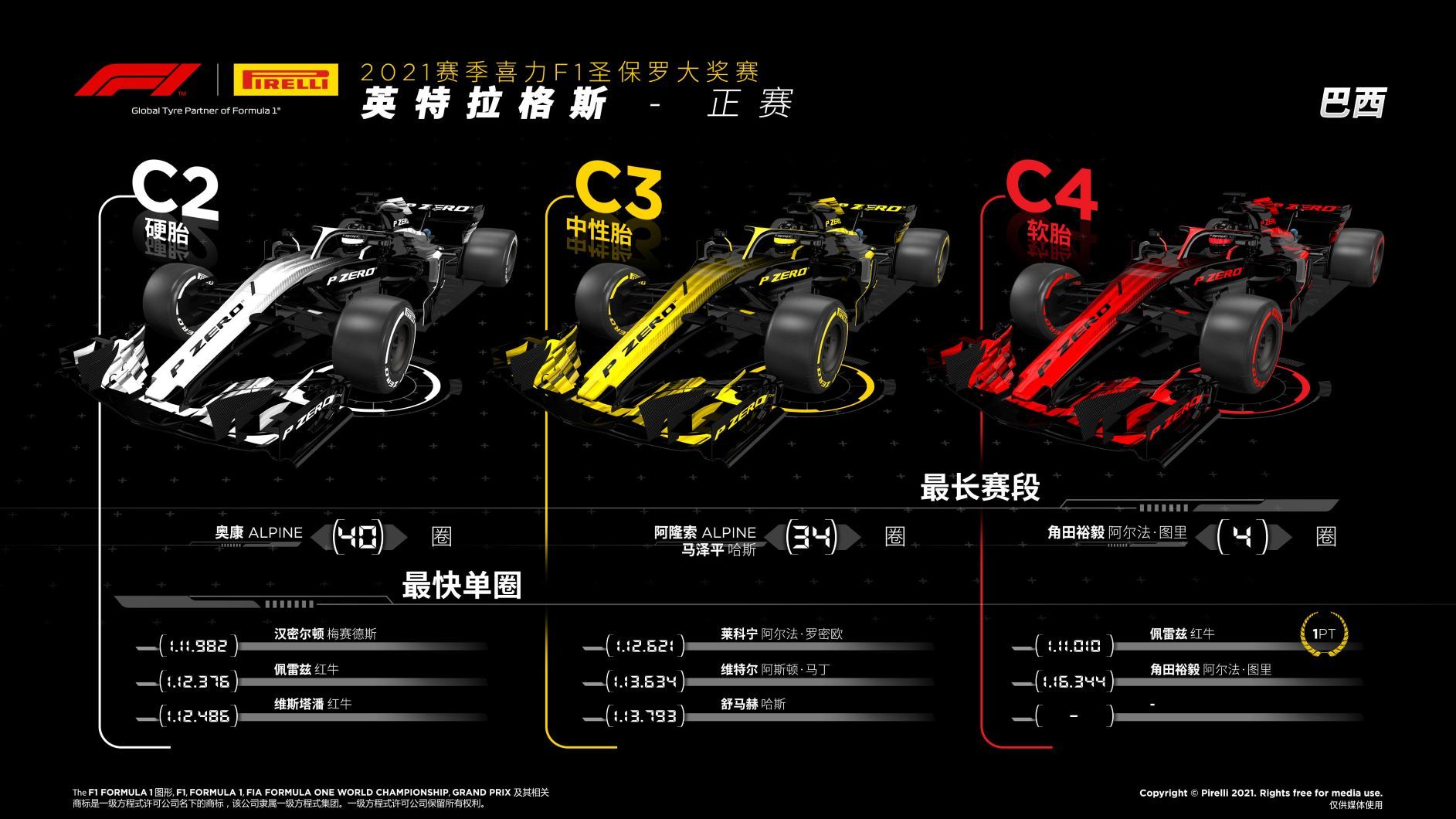• 中性胎C3:几乎所有车手都选择了这一配方作为起步轮胎。第一次安全车,再加上两次虚拟安全车,使得这套轮胎可以跑更长里程的开场赛段,给予车手们应对接下来比赛的更多选择。