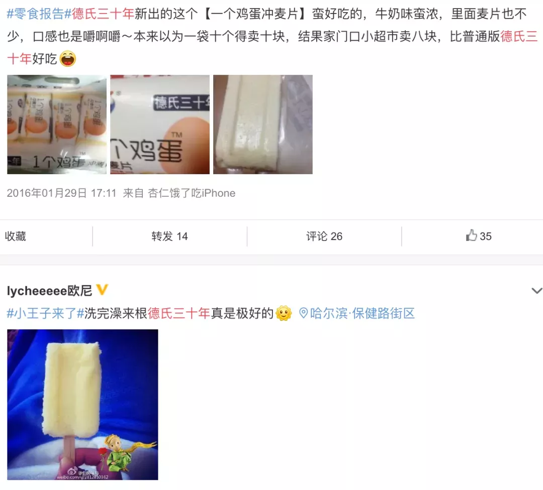 “德氏”也铺货很多,厂在沈阳,一搜微博小红书,有很多拥护者,被人们吹爆的“一个鸡蛋(花生可可雪糕)”“冲麦片雪糕”“小人雪糕榛子果仁雪糕”系列,在东北的小卖店里也可以以1元钱的价格买到。