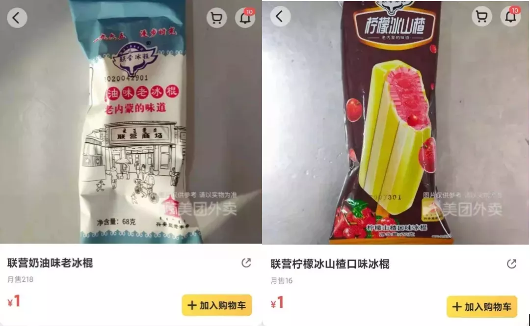 大家的评论除了好吃,还有“小时候的味道”“量太大了”。除了在店里吃,冰棍和雪糕也有“联营”牌。如果是盒装的冰糕,价格普遍在5元,做成冰棍的柠檬冰山楂,柠檬百香果,奶油味老冰棍等,则可以一元钱拿下。