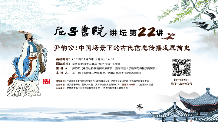 2021年11月20日(周六)14:30,中国社科院新闻所原所长、湖南师范大学新闻与传播学院院长尹韵公教授将莅临屈子书院讲坛第22期,发表《中国场景下的古代信息传播发展简史》的主旨演讲,为您生动地讲述“中国式”信息传播与发展图景。