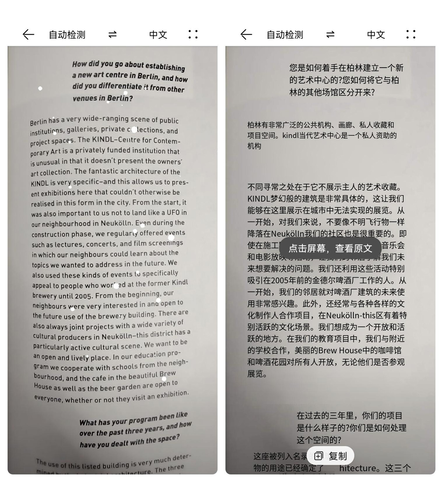 生活中大街小巷上有陌生的外文词汇,也可以通过智慧视觉里的拍照翻译功能进行“汉化”;手机浏览新闻时遇到不认识的英文单词,双指按压屏幕即可呼出全屏翻译功能,使用方法简单,呈现结果直接。
