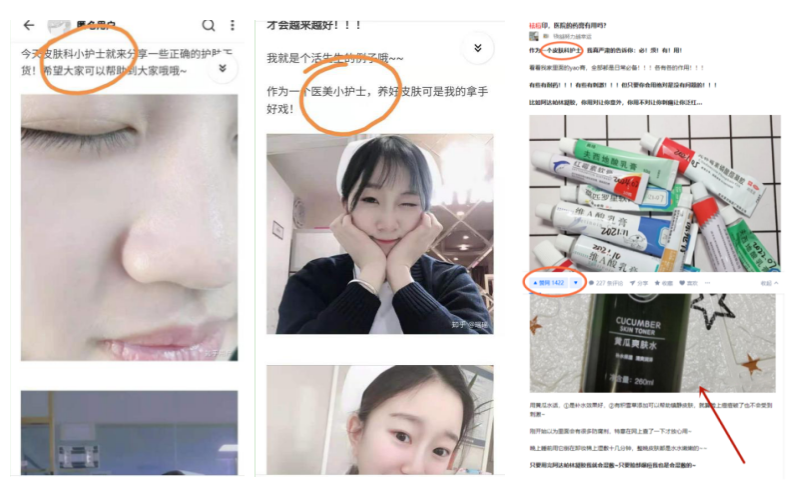 他们公司养了一批账号,几个营销账号来回切换,有的连开头结尾和配图都不换。人设不一样,图一样(喂,你穿帮了大哥)。他们带货也是,从来不提研发、品牌方实力这些,只吹产品“功效”。你去看看瑷尔博士、玉泽、薇诺娜的推广,哪个不是先从实力背景入手。为什么不敢吹?因为根本就不存在研发,全部是工厂批发。