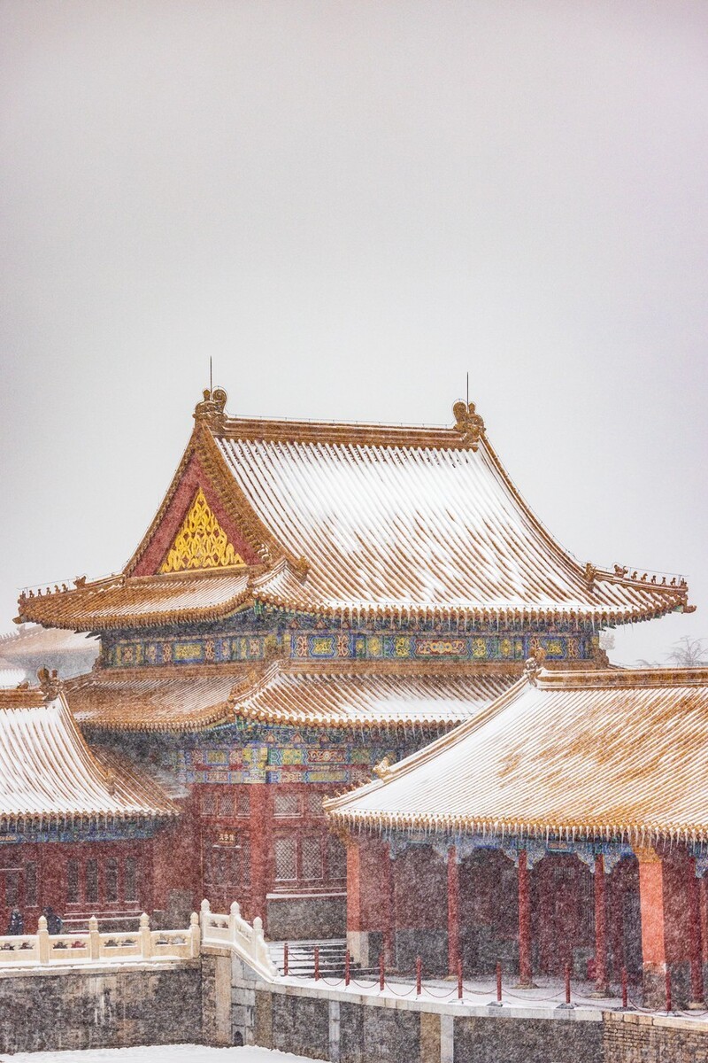 千重宫阙,在一场大雪睡去,又在一场大雪中醒来,雪花飘舞中,红墙金瓦更加庄严肃穆,让人恍若置身于六百年前的紫禁城。