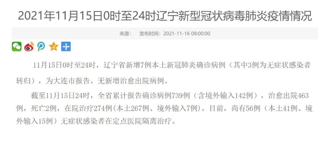 11月15日0时至24时,辽宁省新增7例本土新冠肺炎确诊病例(其中3例为无症状感染者转归),为大连市报告。 无新增治愈出院病例。