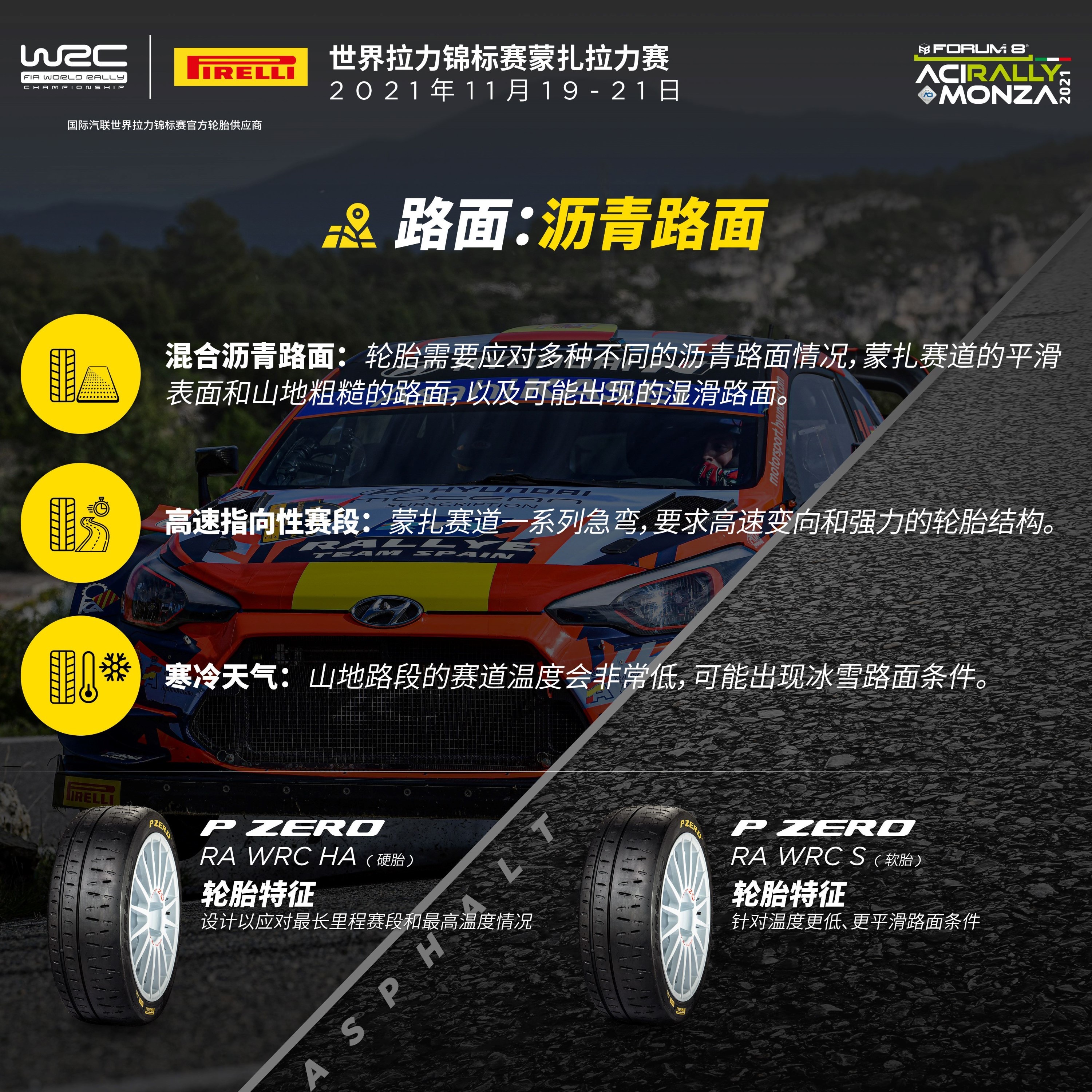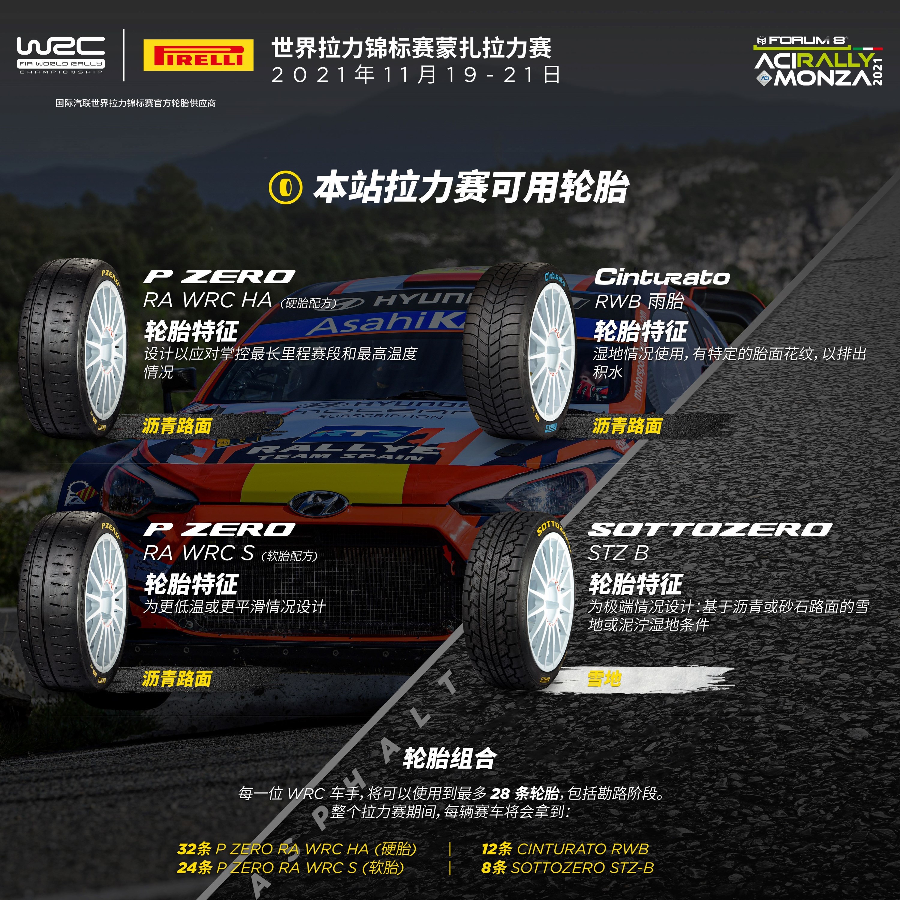 P Zero RA WRC轮胎:倍耐力的沥青路面轮胎,带来两种不同配方。全新的硬胎配方(P Zero RA WRC HA轮胎)将会是意大利的主选轮胎,这款轮胎在上一站西班牙的比赛中完成首秀,展示了其在长里程赛段和高赛道温度情况下的稳定性。而软胎(P Zero RA WRC S轮胎)也作为可用选项,在更低温或更湿滑路面条件下提供抓地力。