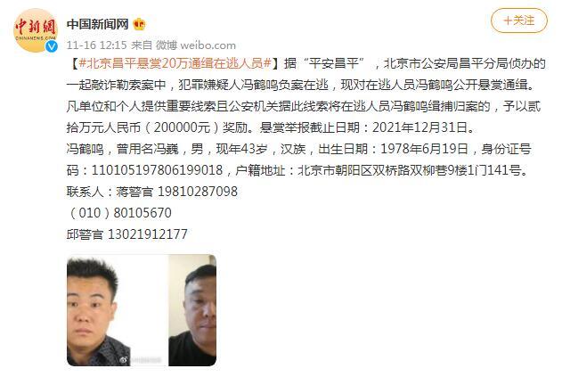 【北京昌平悬赏20万通缉在逃人员】据“平安昌平”,北京市公安局昌平分局侦办的一起敲诈勒索案中,犯罪嫌疑人冯鹤鸣负案在逃,现对在逃人员冯鹤鸣公开悬赏通缉。凡单位和个人提供重要线索且公安机关据此线索将在逃人员冯鹤鸣缉捕归案的,予以贰拾万元人民币(200000元)奖励。悬赏举报截止日期:2021年12月31日。