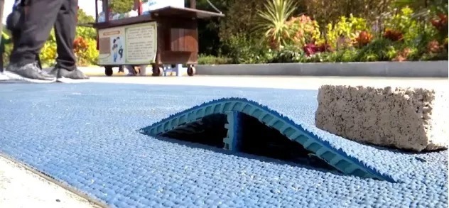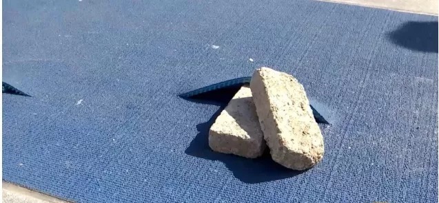 记者在现场看到,草海大坝塑胶步道上确实有密密麻麻的破口,破口的切面都十分整齐,同时这些破口处还都用砖头或者零碎塑胶撑了起来,边上还摆有许多砖块。