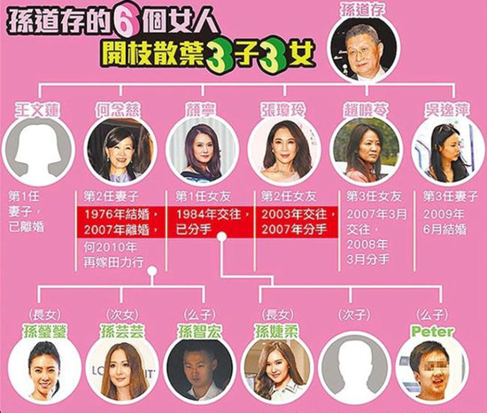 孙道存在与何念慈婚姻续存期间,曾多次出轨。他跟女星颜宁同居十多年,两人育有一女二子,后来又跟张琼玲、赵晓苓交往过。