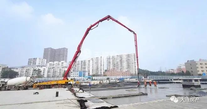 近日,在大连北站综合交通枢纽项目施工场地,记者看到该项目主体已经完工,在项目的屋面层,随着一辆满载混凝土的车辆缓缓驶来,剩下三分之一的屋面混凝土浇灌工程正在如火如荼地进行,几名施工人员协力合作,有的工人正在浇灌,有的工人平整混凝土。